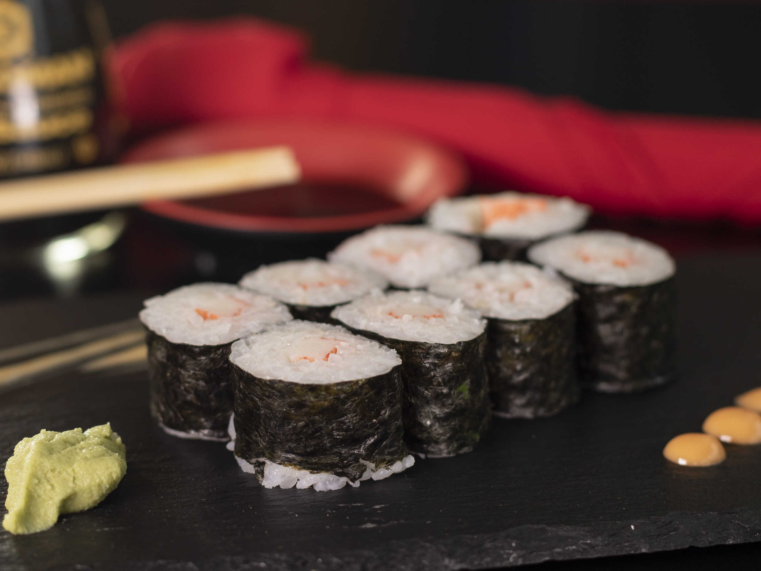 Salmón, aguacate, pepino cobertura de queso crema y semillas de ajonjolí.