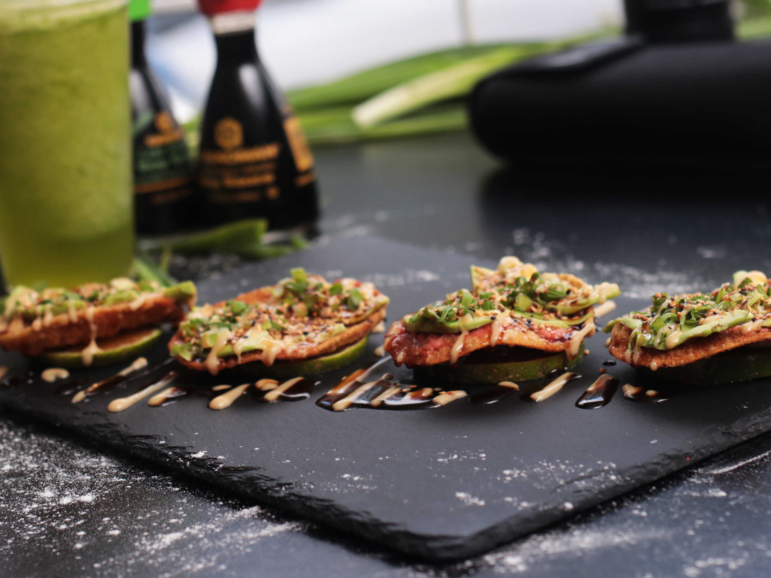 4 tortillas de wantan con atún fresco semipicante, aguacate, cebollino y salsa de casa.