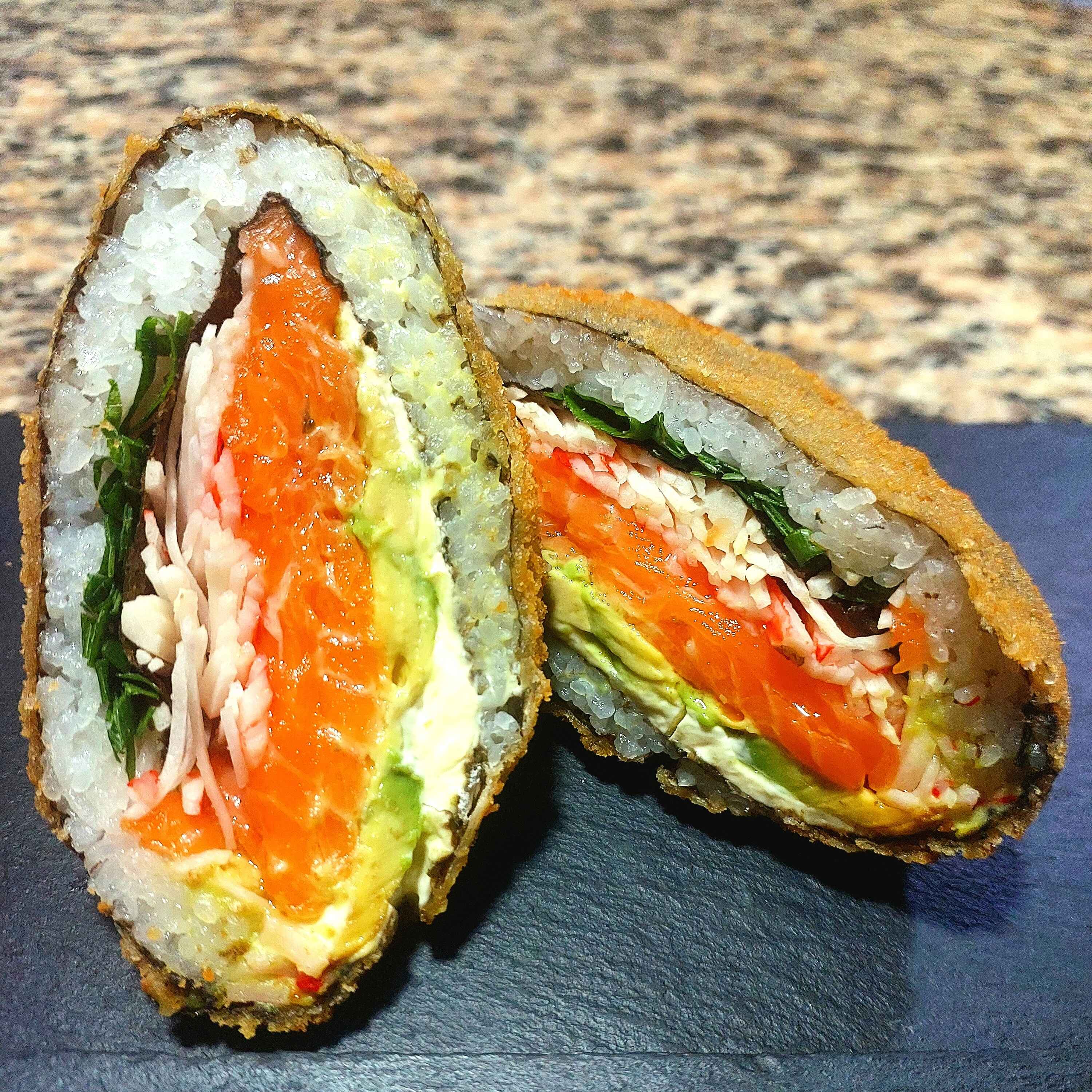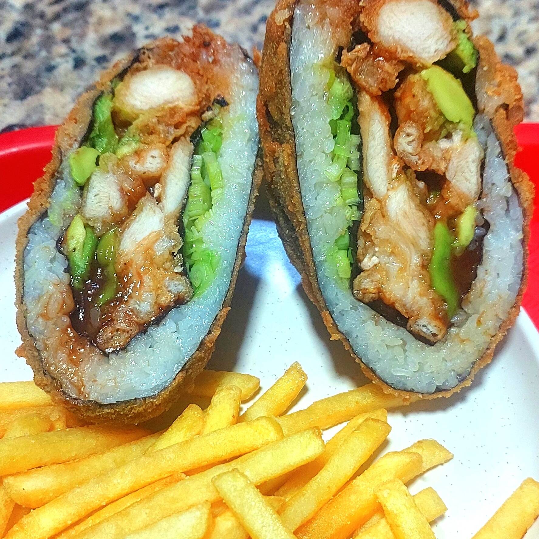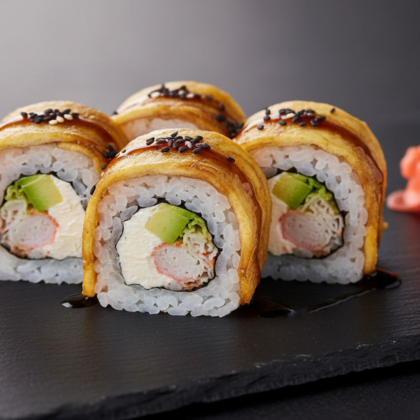 Tocineta, aguacate, queso crema, plátano maduro, cubierto de ajonjolí y salsa anguila.