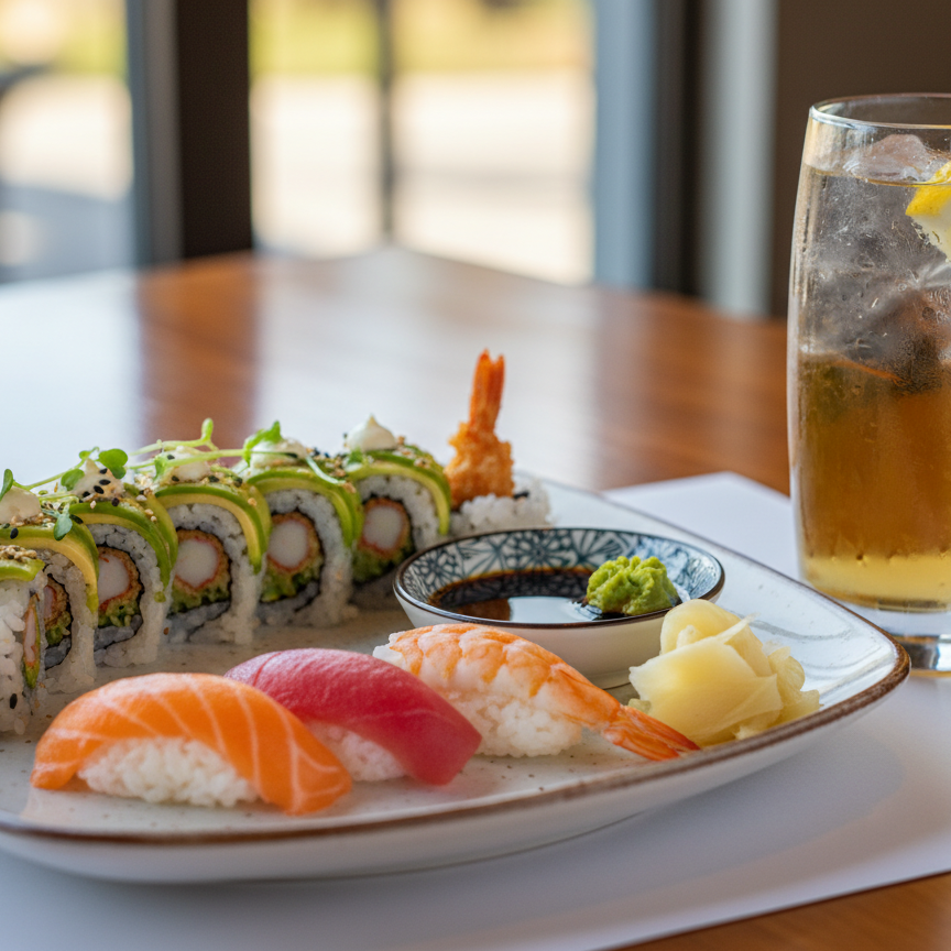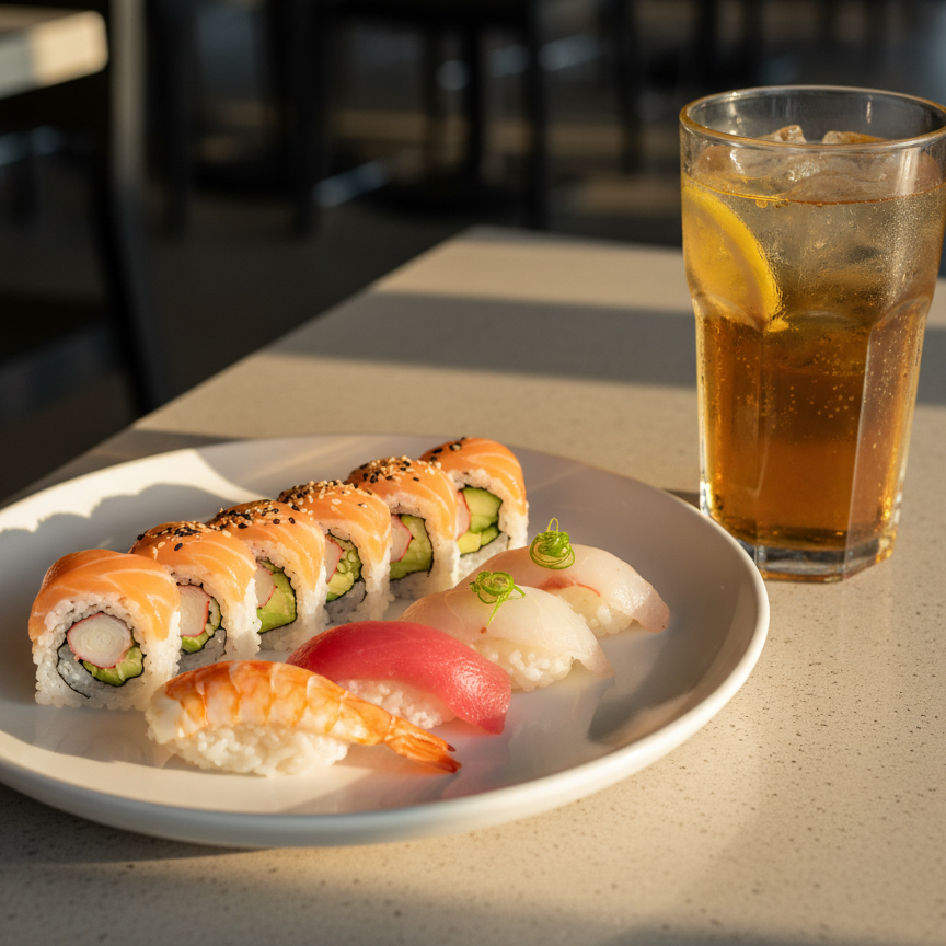 1 rollo de sushi clásico, 1 acompañamiento, 1 bebida natural.