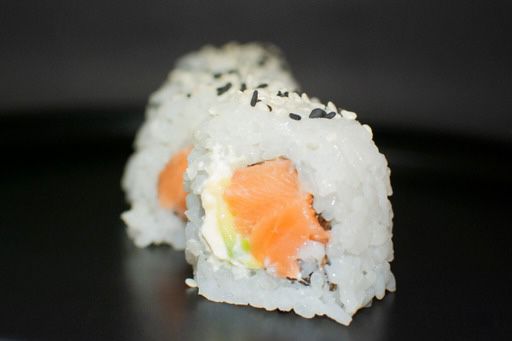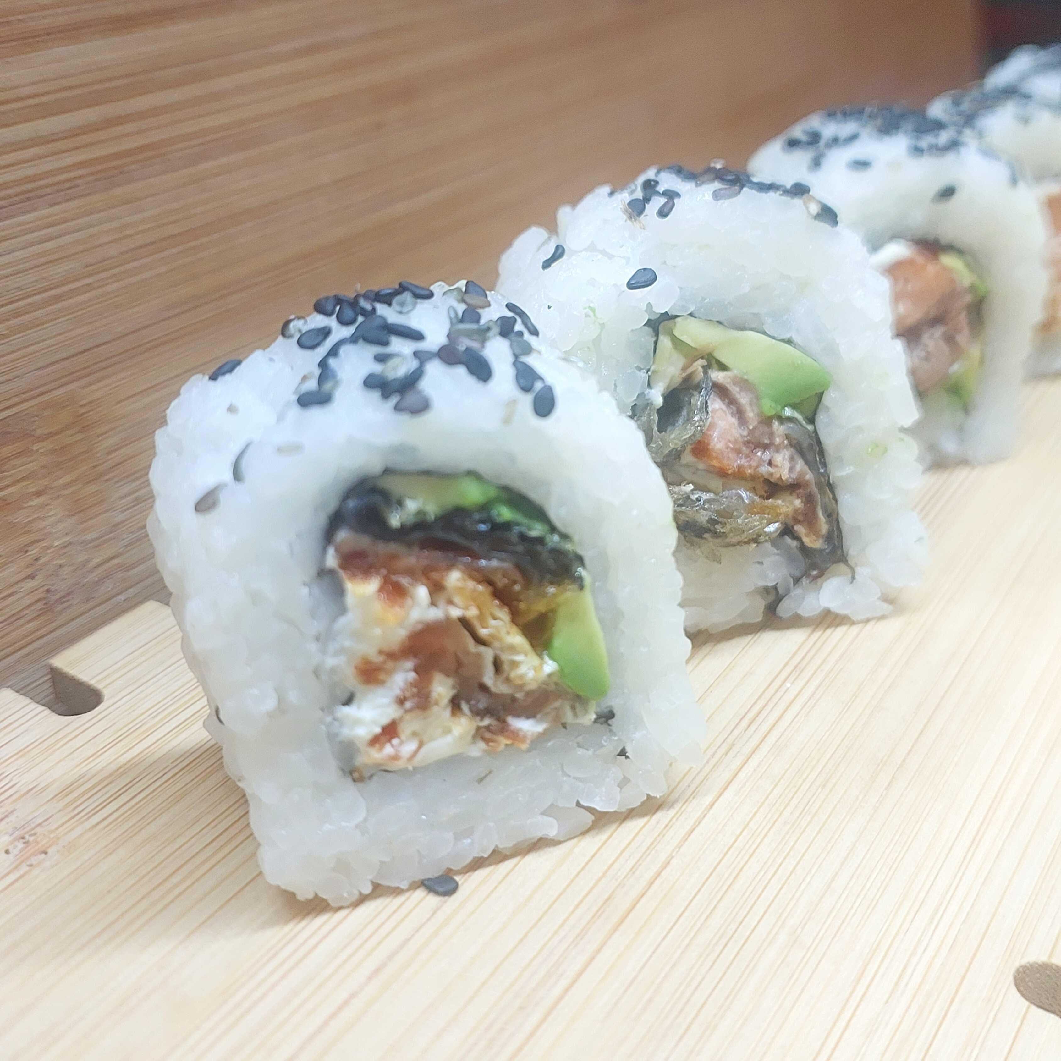 Salmón, aguacate, queso crema cubierto de ajonjolí y salsa anguila.