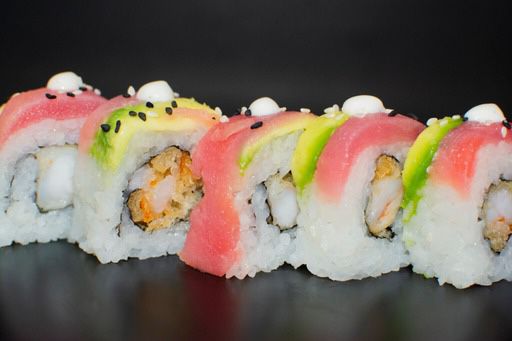 Surimi, aguacate, pepino, cubierto de atún, salmón, aguacate y ajonjolí.