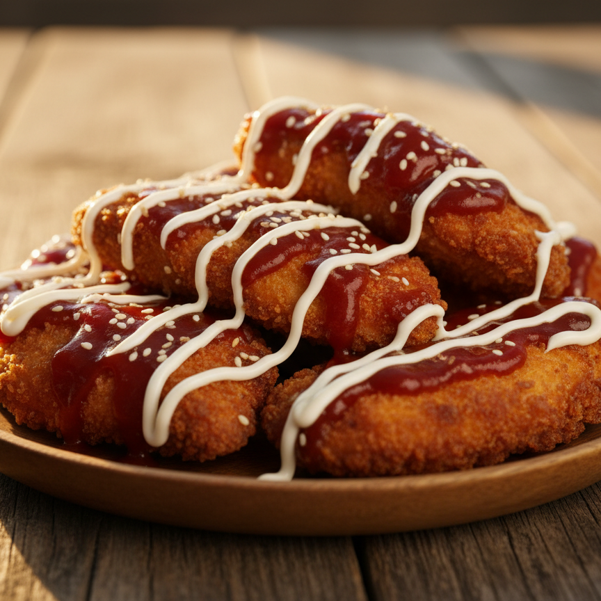 Pollo empanizado con salsa barbacoa, cubierto de ajonjolí y salsa mayo.