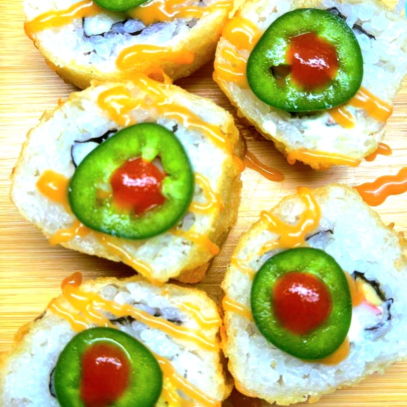 Rollo tempura de surimi, aguacate, queso crema, cubierto de jalapeño y salsa picante.