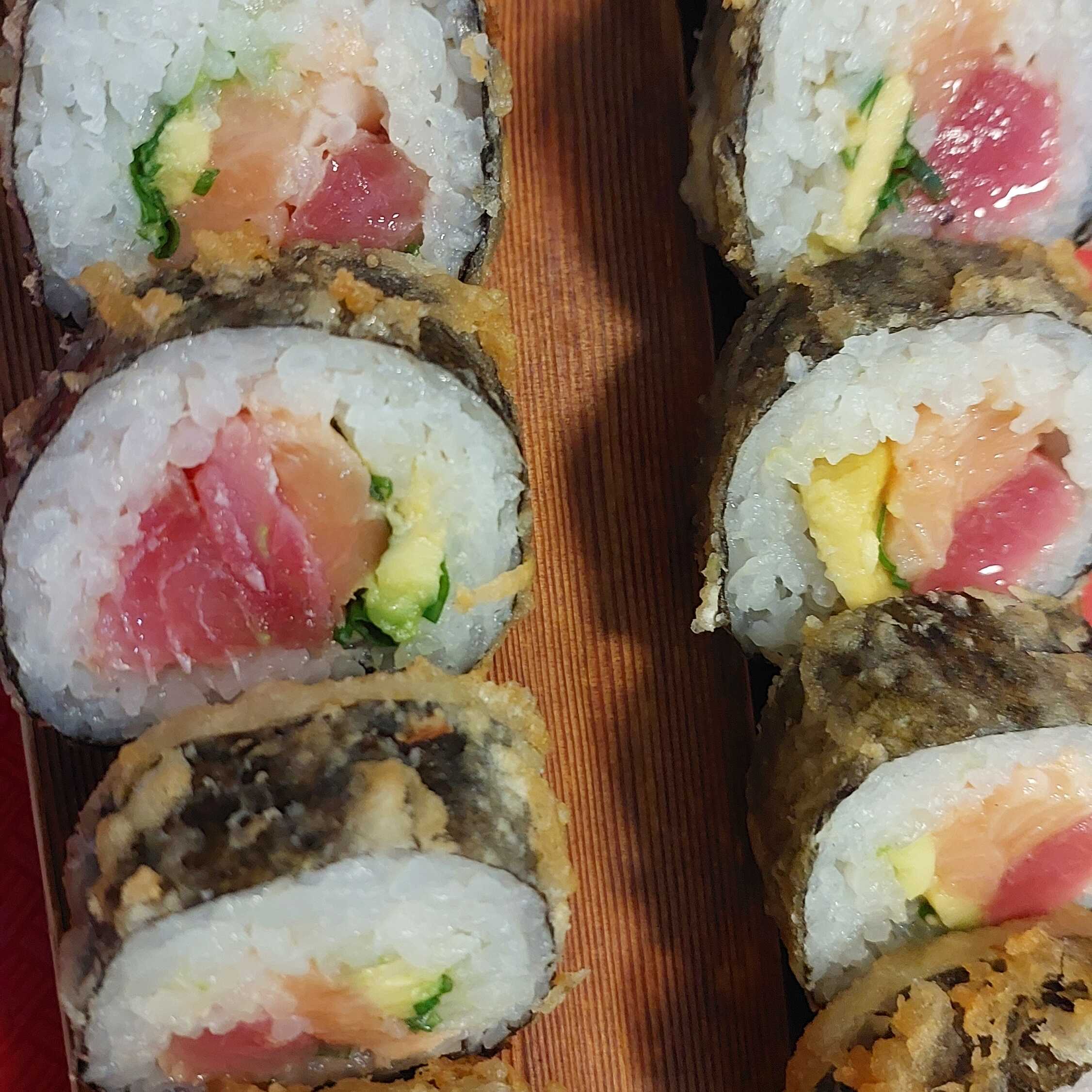Rollo tempura con salmón atún, aguacate y cebollino, con cobertura de alga.