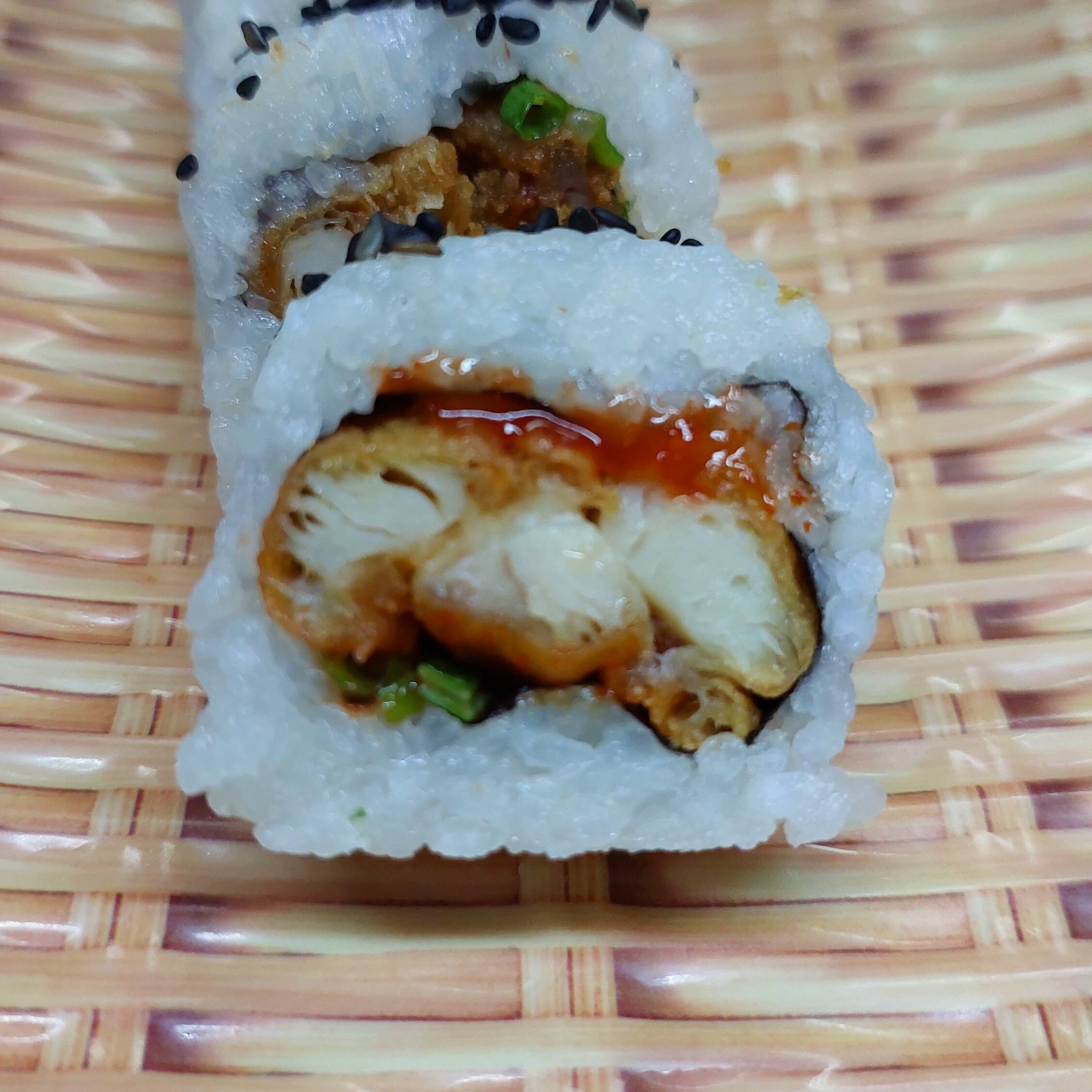 Surimi, aguacate, pepino, cubierto de queso crema y arroz tostado.