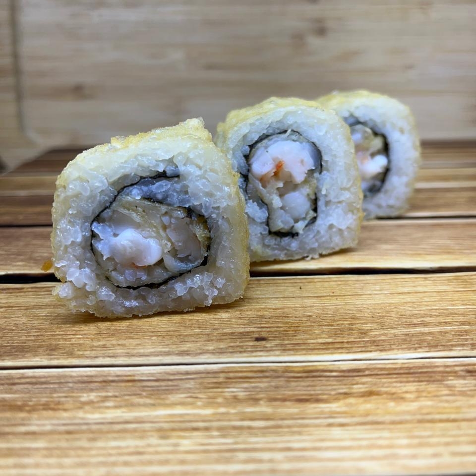 Rollo tempura de surimi, aguacate, pepino, flameado cubierto de salsas perejil y anguila.