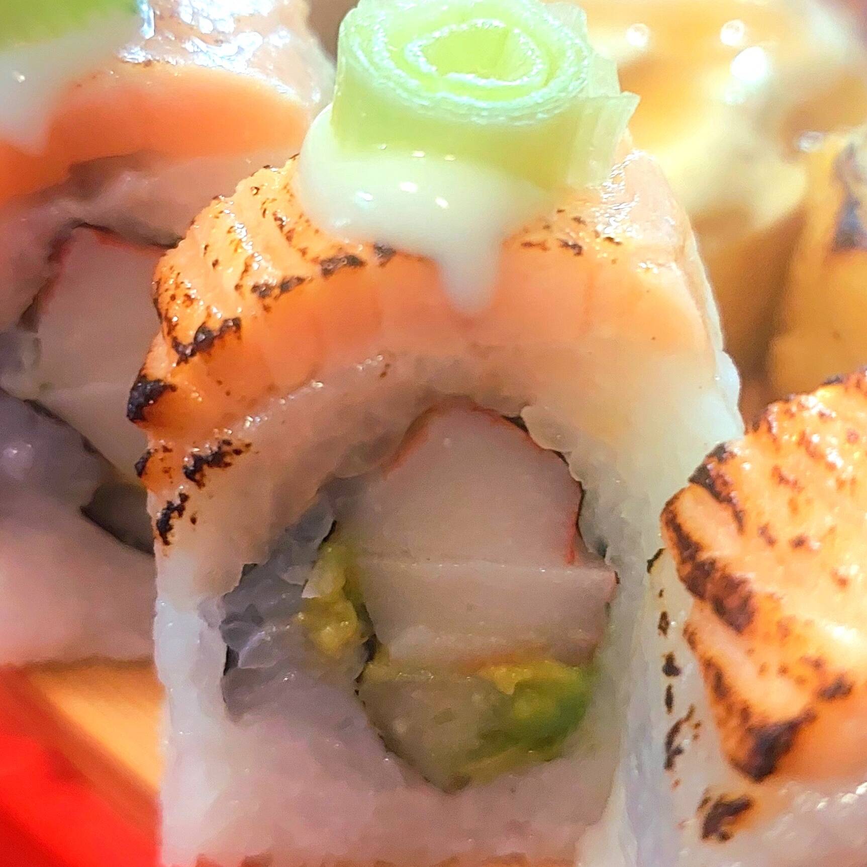 Surimi, aguacate, pepino, cubierto de salmón flameado con cebollino y salsa mayo.