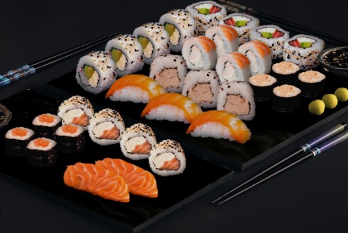 6 Piezas de california, 4 piezas de filadelfia, 4 piezas de salmón roll, 4 piezas de tuna roll, 8 piezas tuna maki, 6 piezas de nigiri surtido, 2 lonjas de tuna sashimi y 2 lonjas de salmón sashimi.
