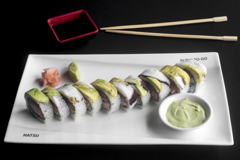 Atún, aguacate, cebollín, salsa picante y semillas de ajonjolí.