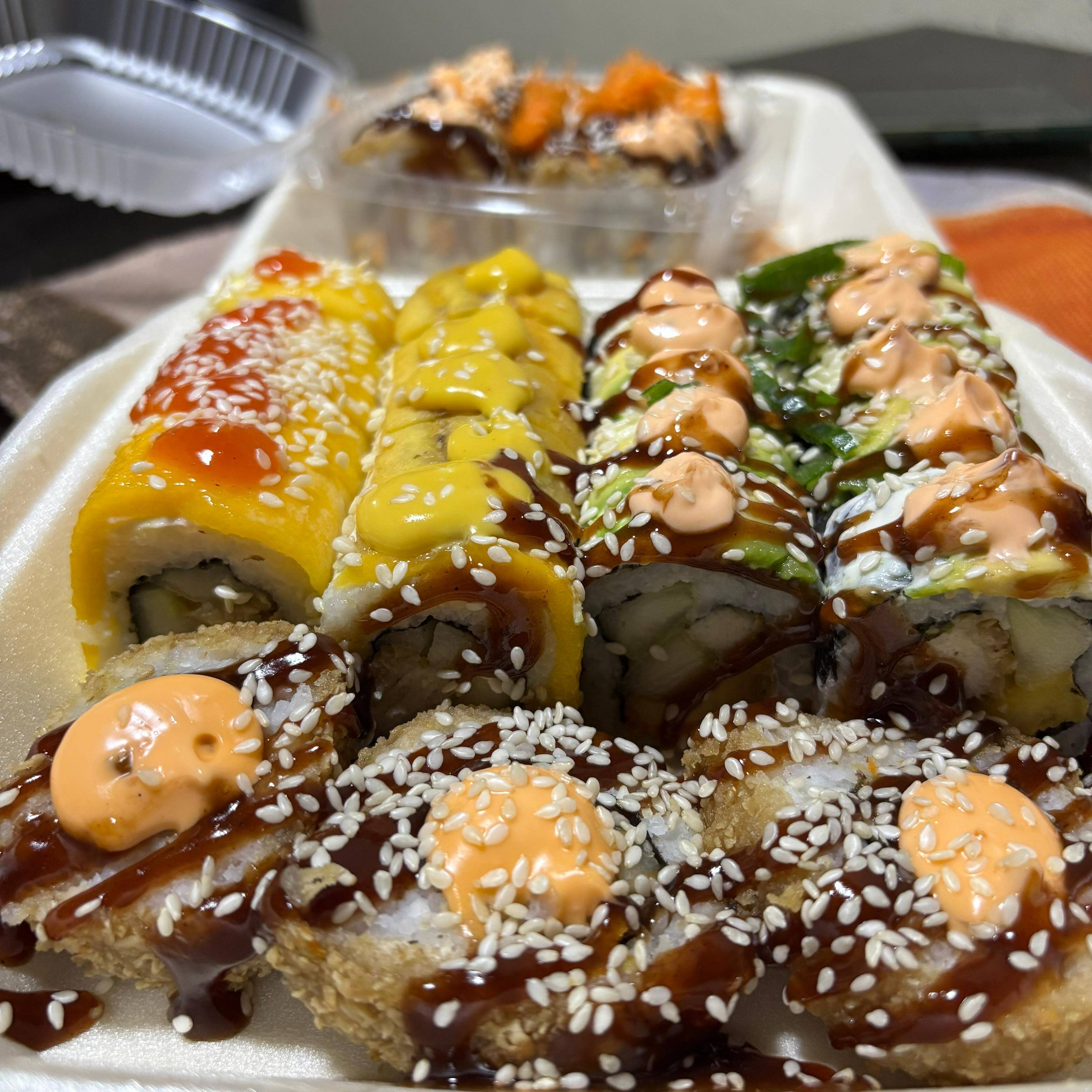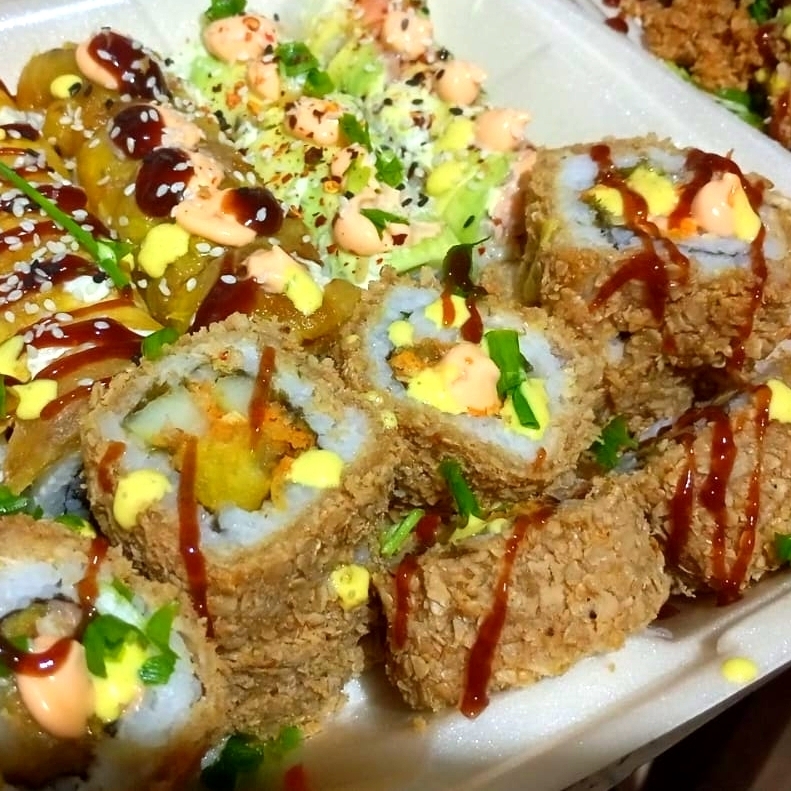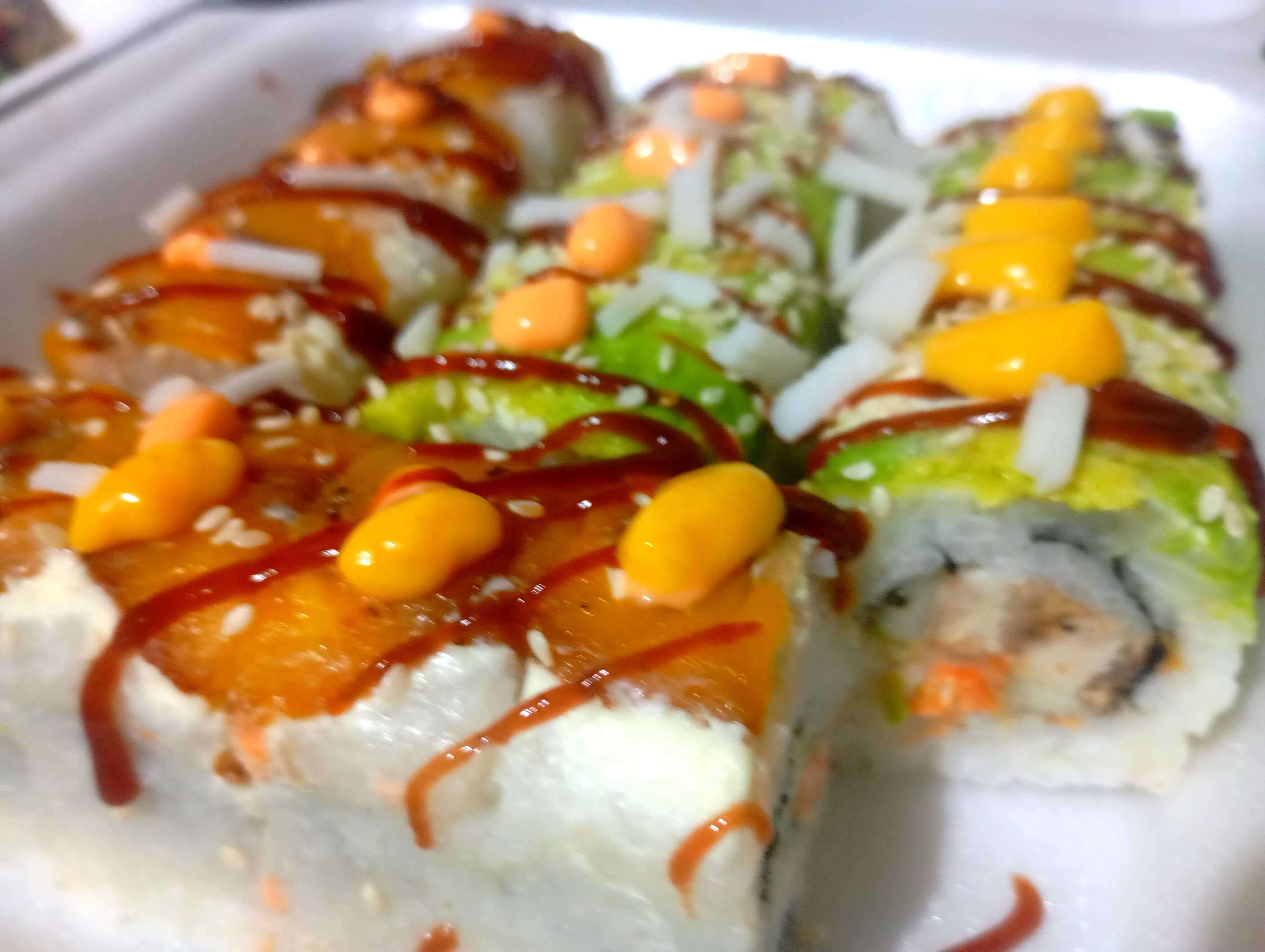 20 Piezas de tres sabores diferentes, a escoger tales como: rico rollo, nuevas roll, cali roll, spicy chicken, roll kanikama, roll lleva salmón relleno, pepino y queso crema.