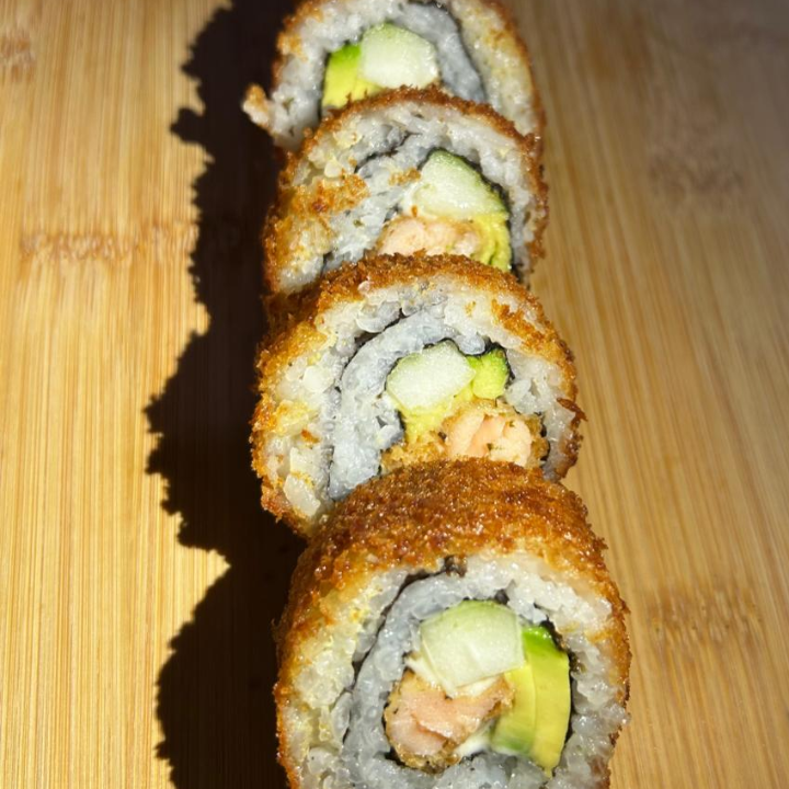 10 Rollos, salmon fresco, queso crema y pepino, por fuera cobertura camaron picante