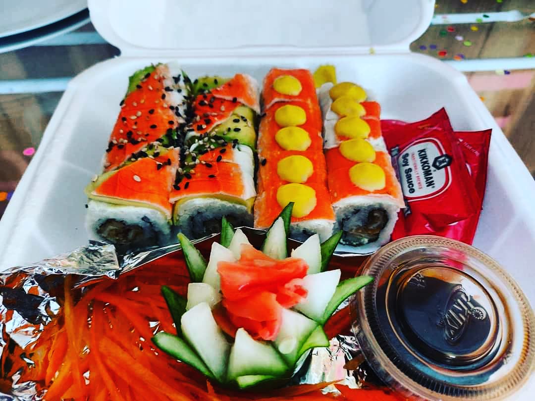 20 piezas de tres sabores diferentes a escoger tales como Rico rollo Nuevas roll Cali roll Spicy Chicken roll Kanikama roll Lleva salmón relleno pepino y queso crema