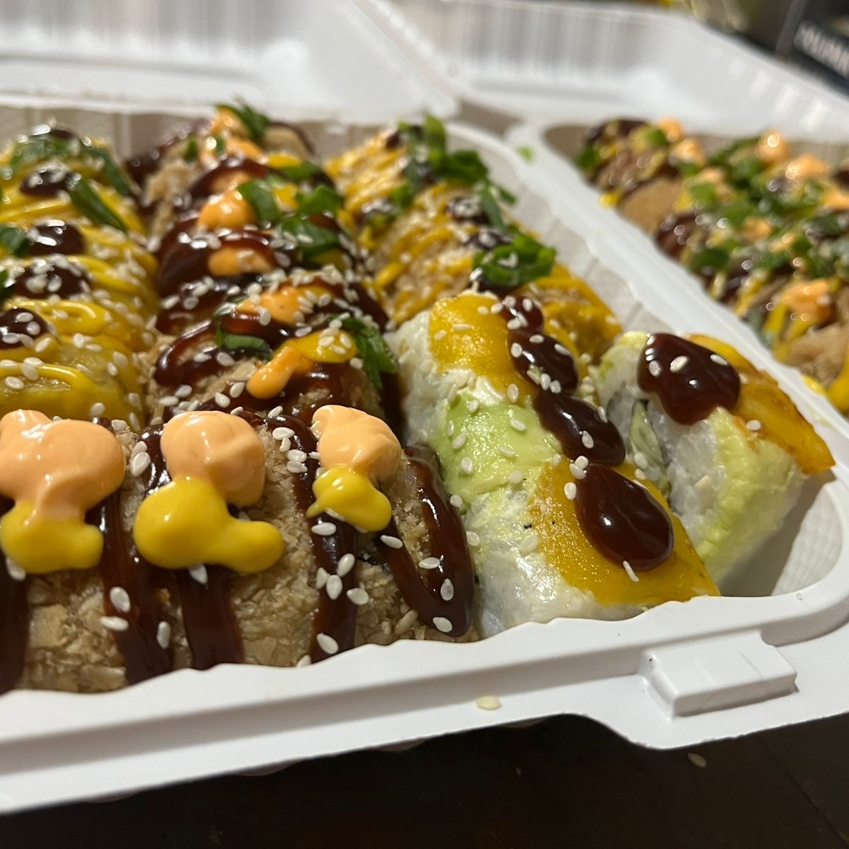 Cali Fo Roll: Pepino aguacate quesocrema surime empanizado + Nevado Roll: Kanikama empanizado, pepino, queso crema con coberturade queso crema.