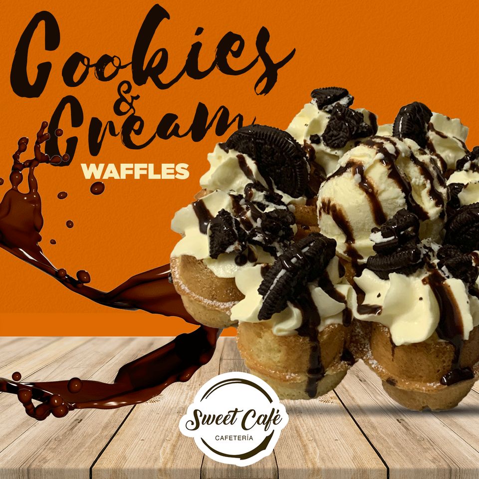 Waffle de vainilla, galleta Oreo, crema chantilly, glaseado con chocolate liquido y leche condensada, acompañada con helado de vainilla.