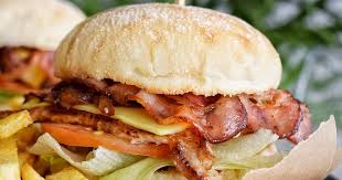 Carne de cerdo con BBQ, queso mozzarella, cebolla, lechuga y tomate. Acompañado con papas gajo