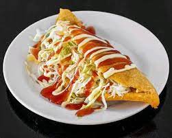 Empanada de maíz rellena de carne, lechuga, tomate y salsas