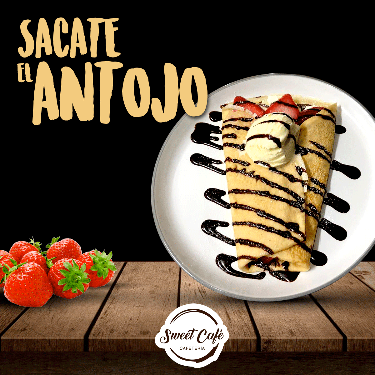 Crepa con nutella, fresas frescas, crema chantilly, helado de vainilla. Glaseado con chocolate liquido.