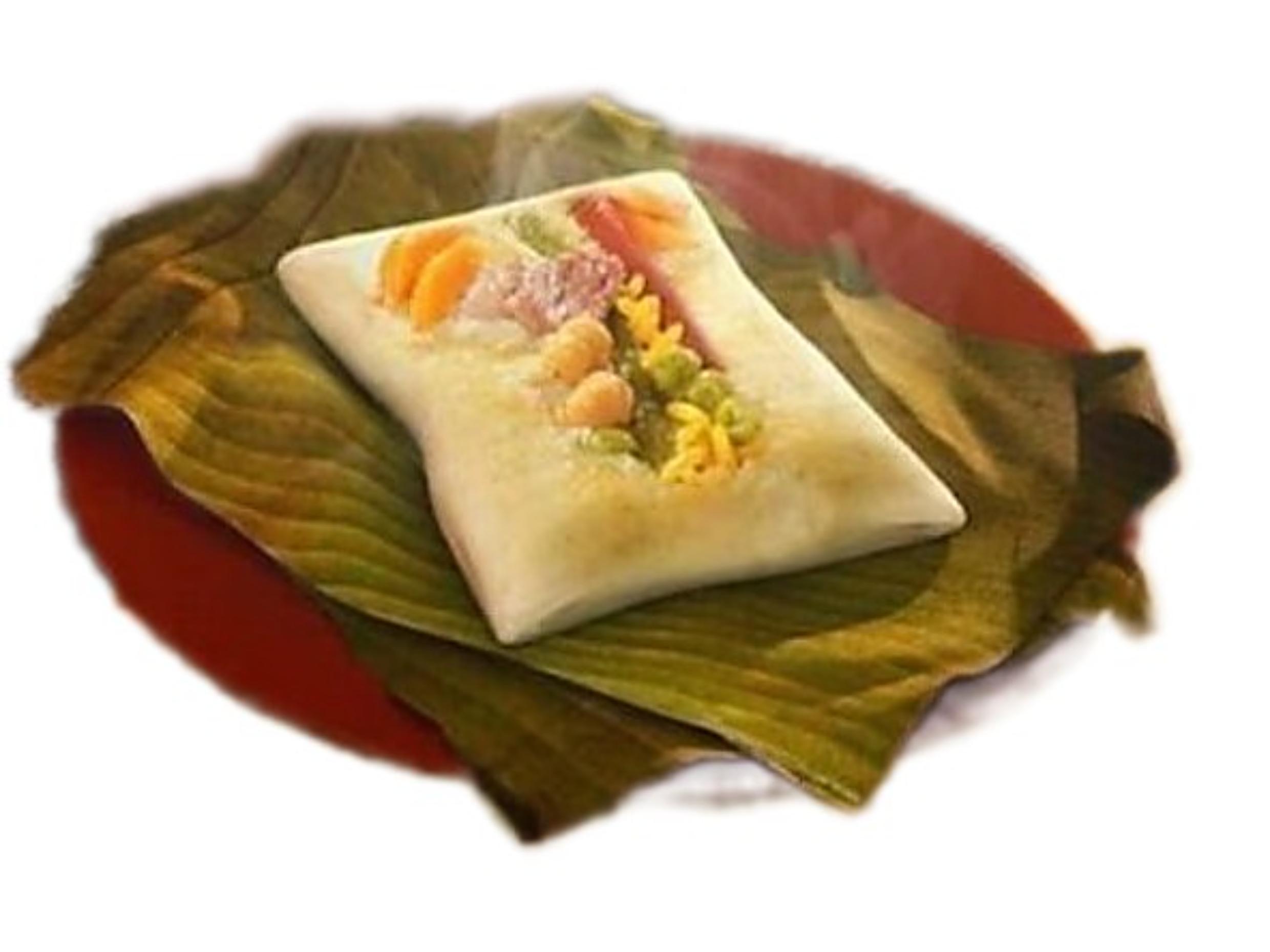 Tamal tradicional, incluye masa de maíz, arroz, carne de cerdo y verduras (zanahoria, papa) envuelta en hojas de plátano.
