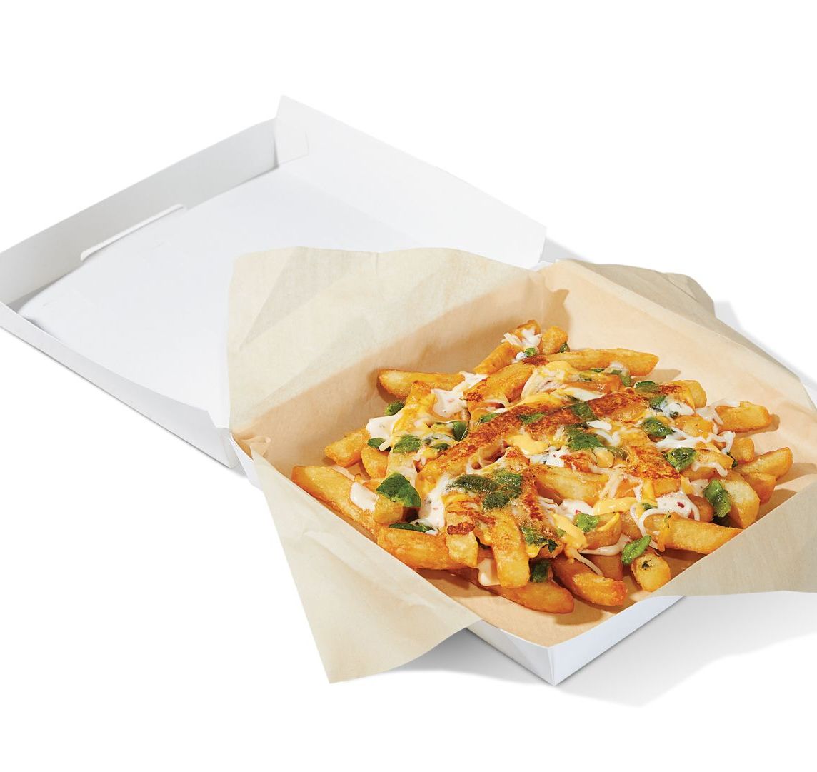 Papas, queso, chile poblano, salsa de queso y aderezo spicy ranch.