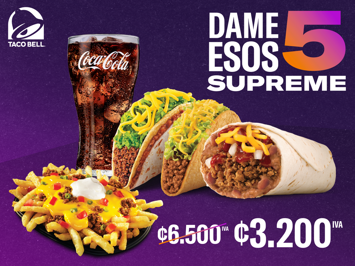Chalupa Supreme + Burrito 5 capas + Taco + Fiesta Fries Supreme + Bebida 22 oz