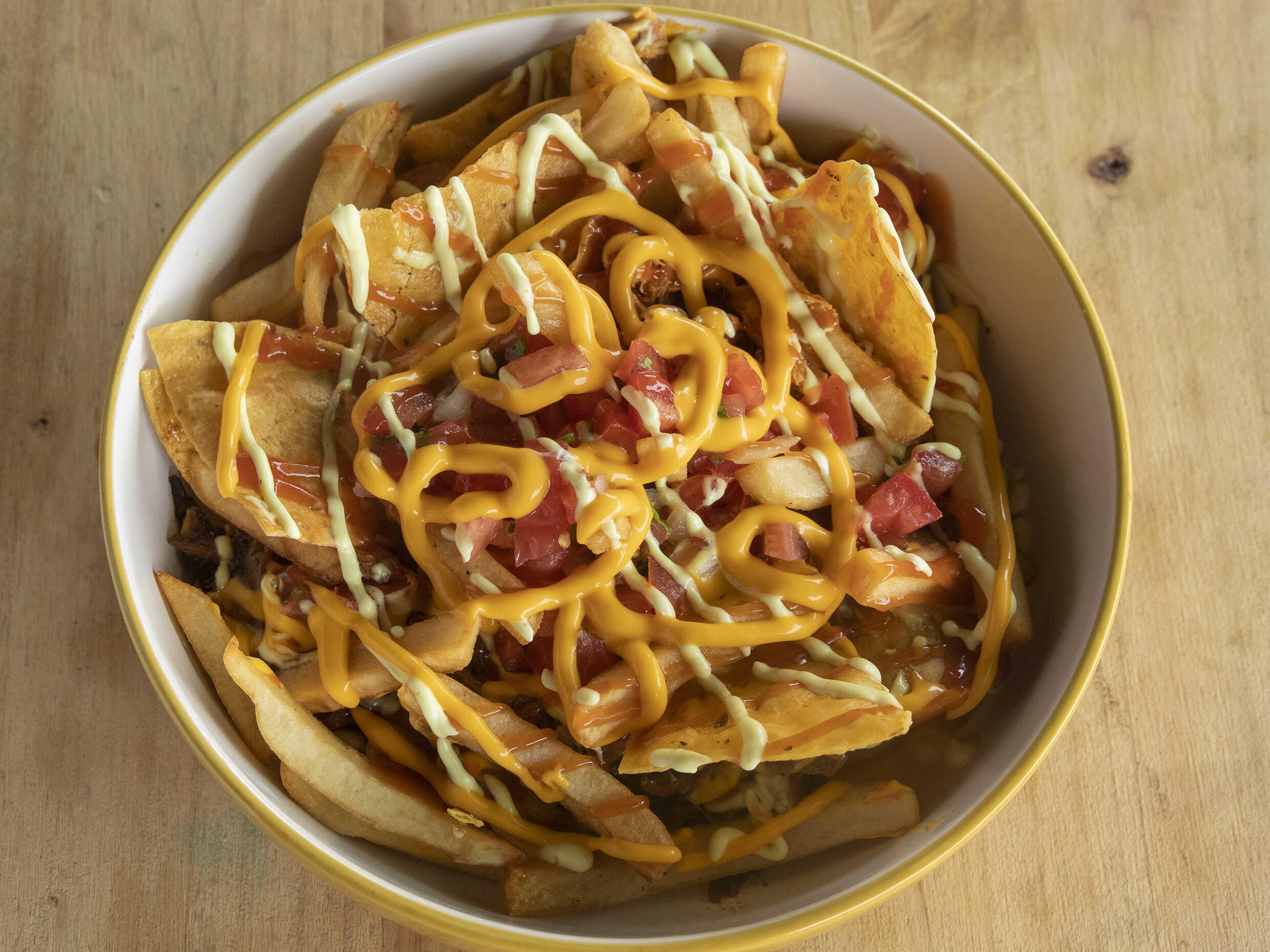 Papas fritas con pollo mechado, salsa de tomate y mayonesa de la casa.
