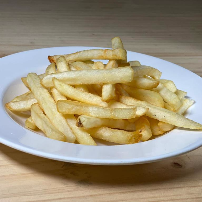 Pan de hamburguesa, 2 tortas de carne molida casera, lechuga, pepino, tomate, cebolla, queso amarillo, jamón, tocineta, salsa de tomate y mayonesa de la casa, acompañada de papas fritas.