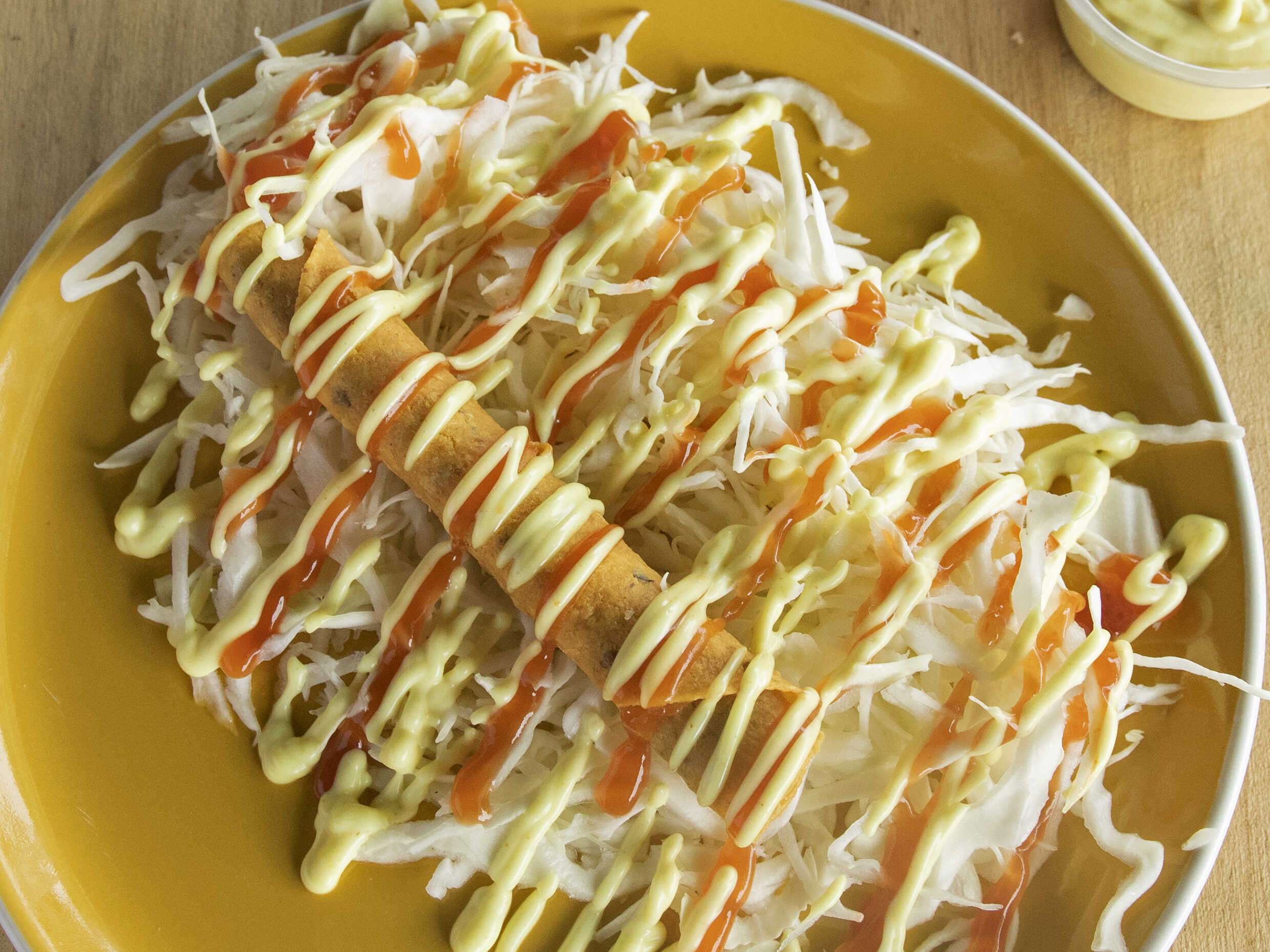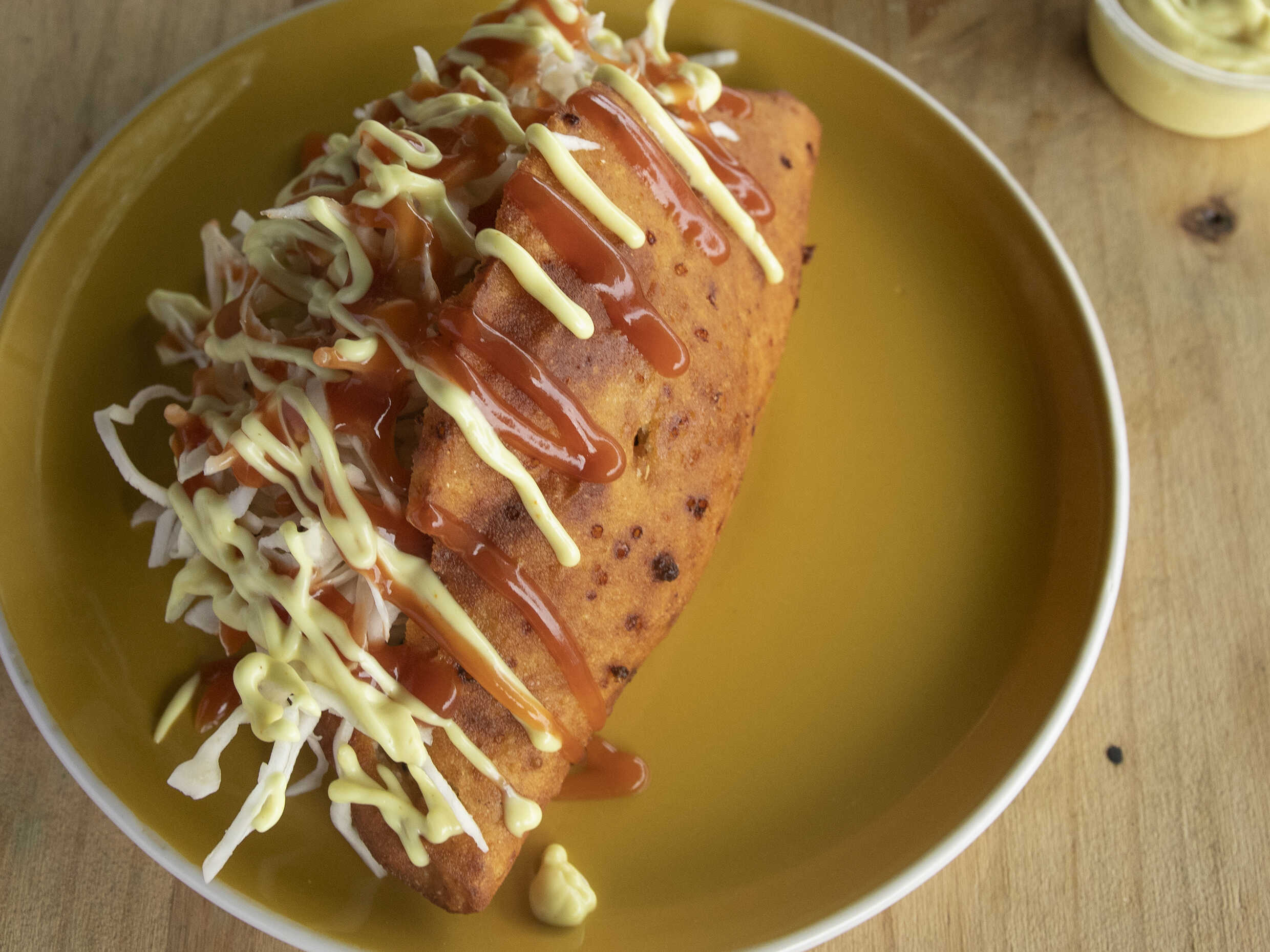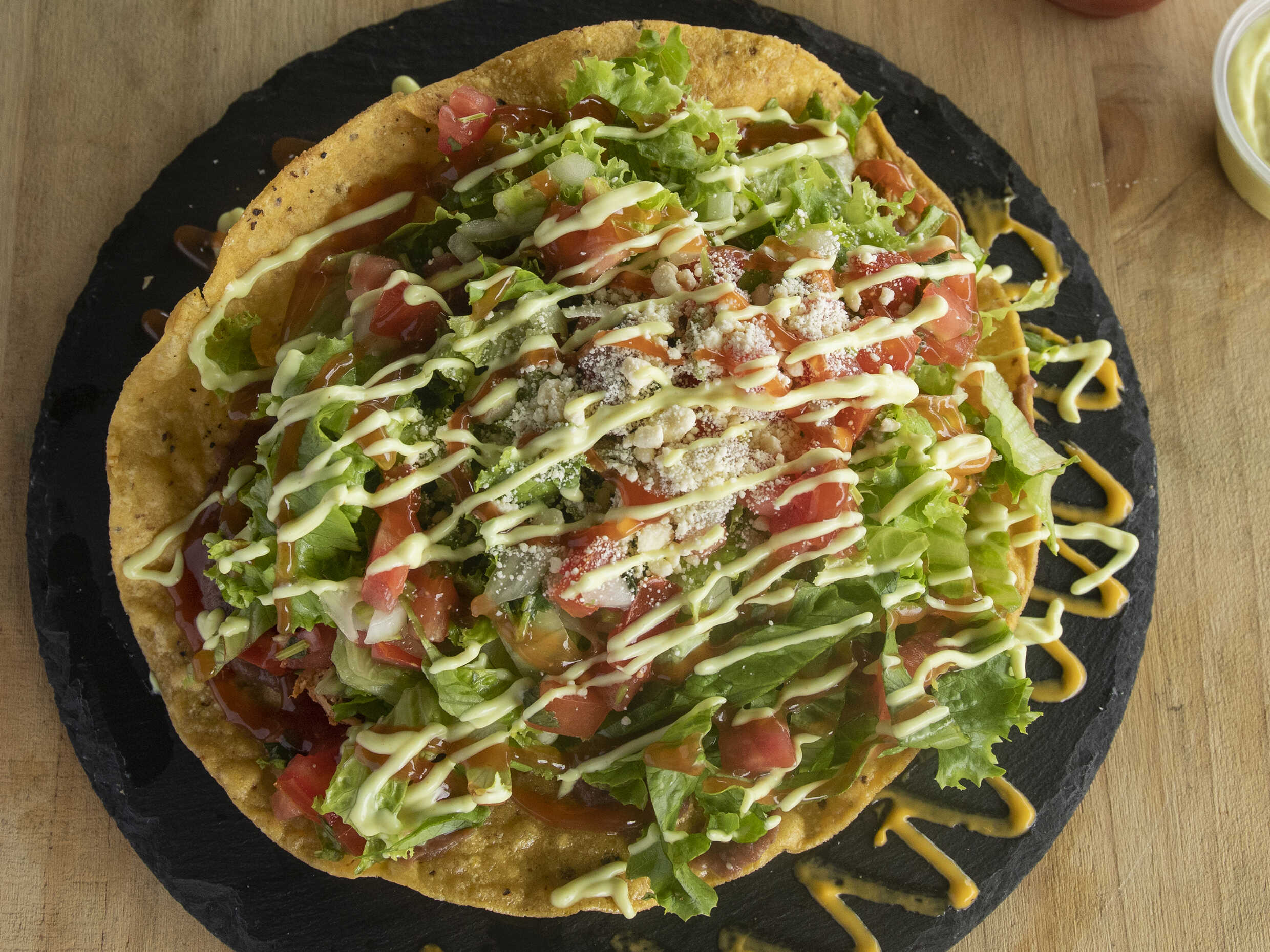 Tortilla de harina frita rellena con su elección favorita (carne, pollo o vegetariana), acompañada de lechuga, pico de gallo, salsa de tomate y mayonesa de la casa.