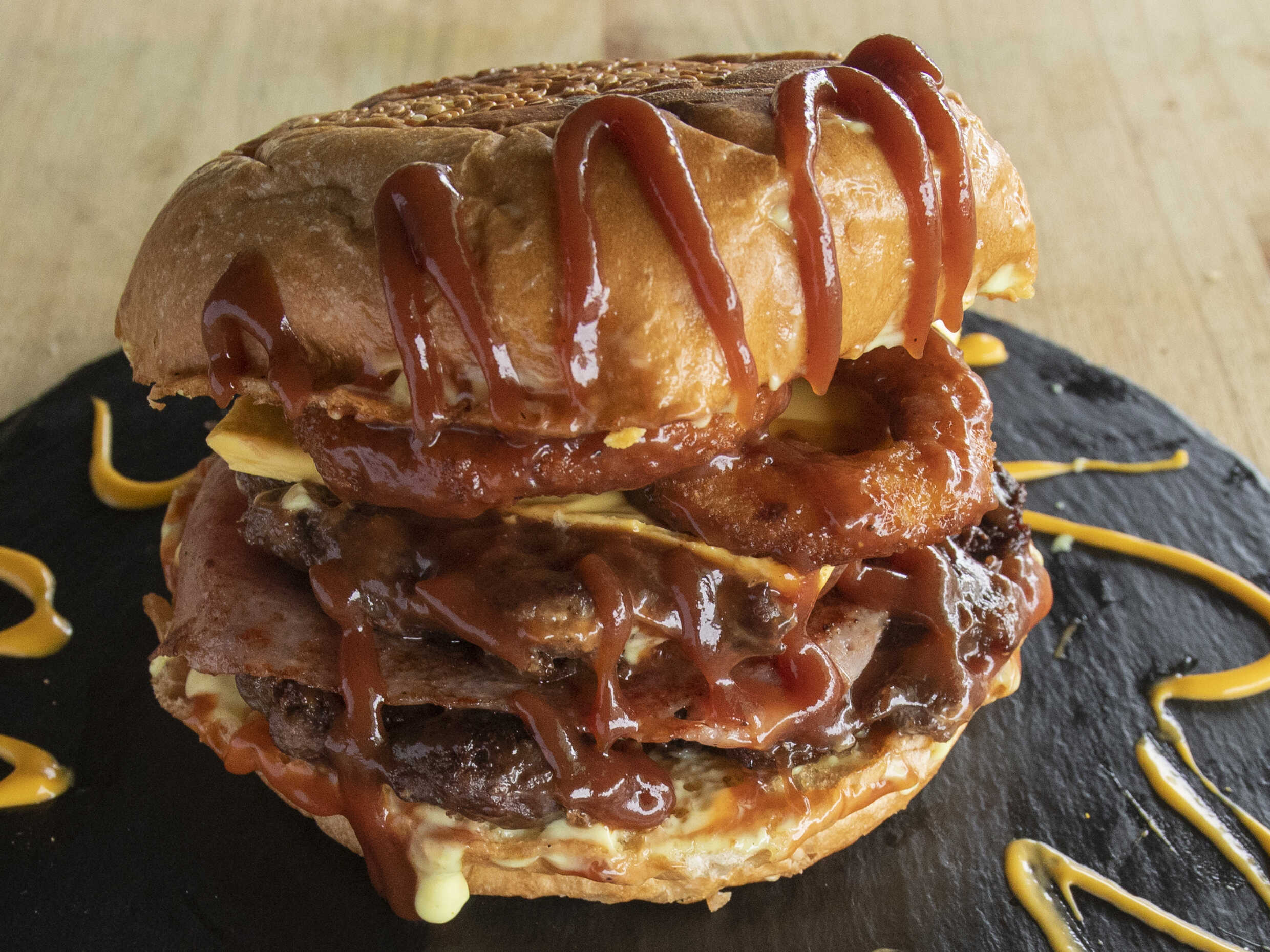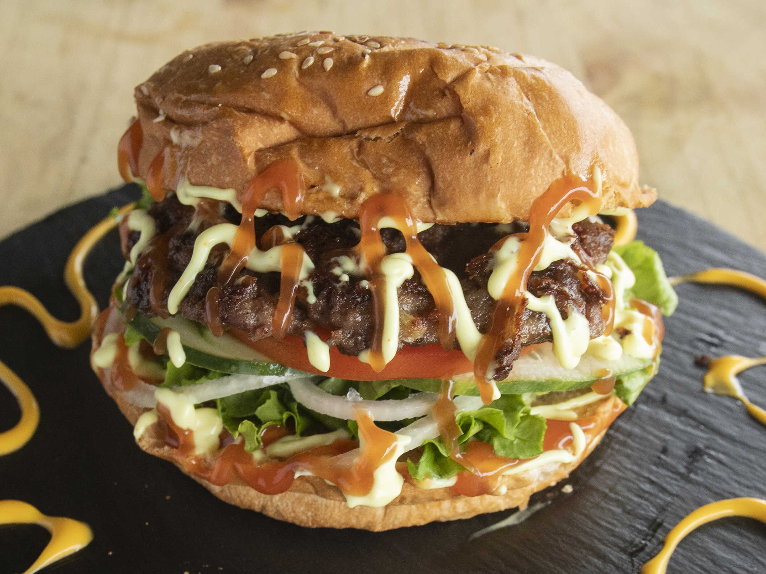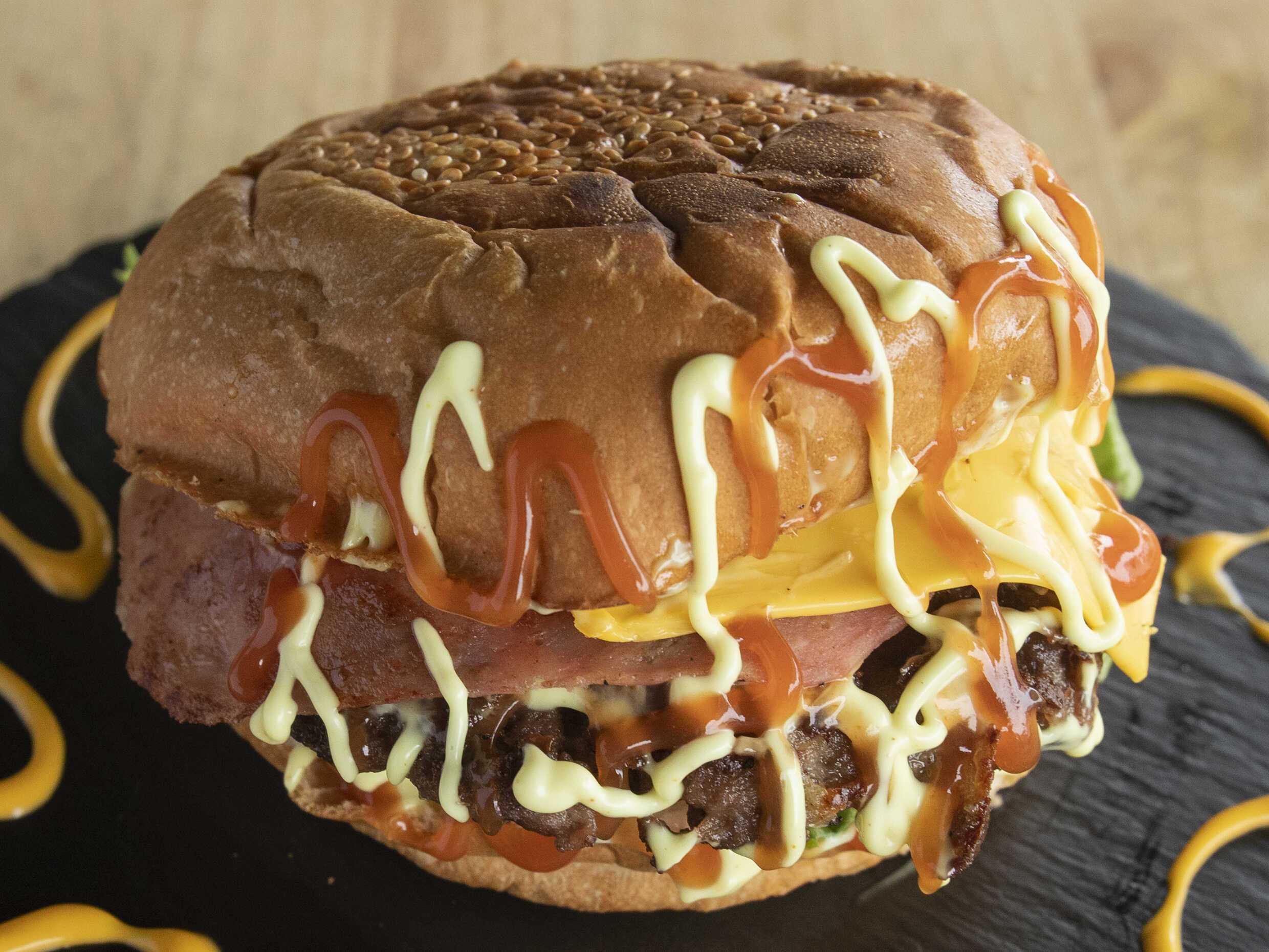 2 Tortas de carne molida casera bañadas en salsa BBQ, queso amarillo, jamón y 2 aritos de cebolla dentro de la hamburguesa.