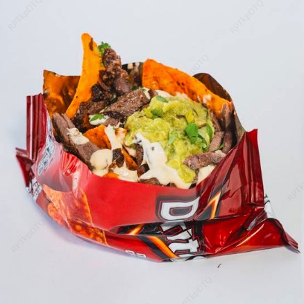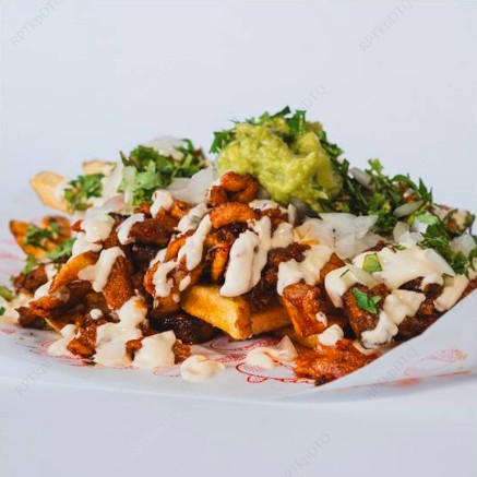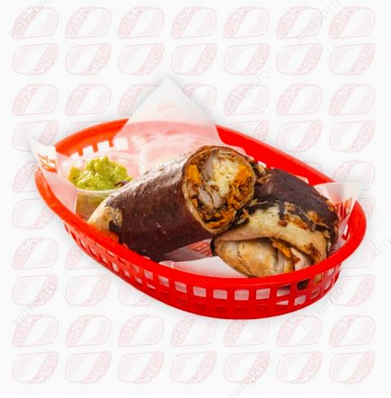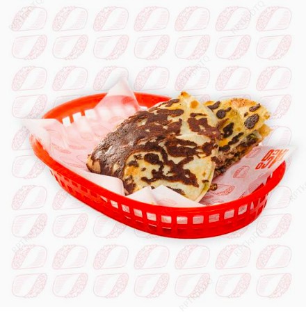 Deliciosa tortila de trigo, frijoles molidos rojos, queso mozarella, doritos, guacamole natilla queso.