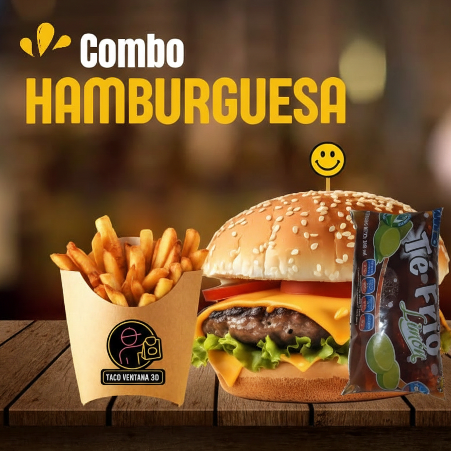 Disfruta de nuestra jugosa hamburguesa con queso derretido, lechuga fresca y tomate, acompañada de crujientes papas fritas doradas y un refrescante té frío para completar la experiencia. ¡La combinación perfecta para tu antojo!