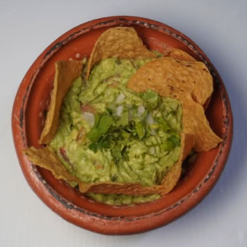 Un aguacate, mezclado con tomate, cebolla, culantro y limón, servido con totopos de maíz.