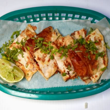 Quesadilla rellena de queso derretido y una proteína a elegir en medio de dos tortillas de harina.