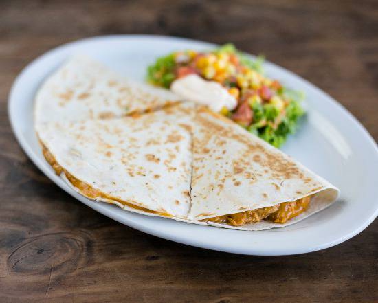 Mezcla de carne a elegir entre pastor, pollo, res, chorizo y hongos, tortilla de trigo con frijoles molidos, cebolla, chile dulce, queso mozzarella, natilla, acompañado de ensalada o papas fritas.