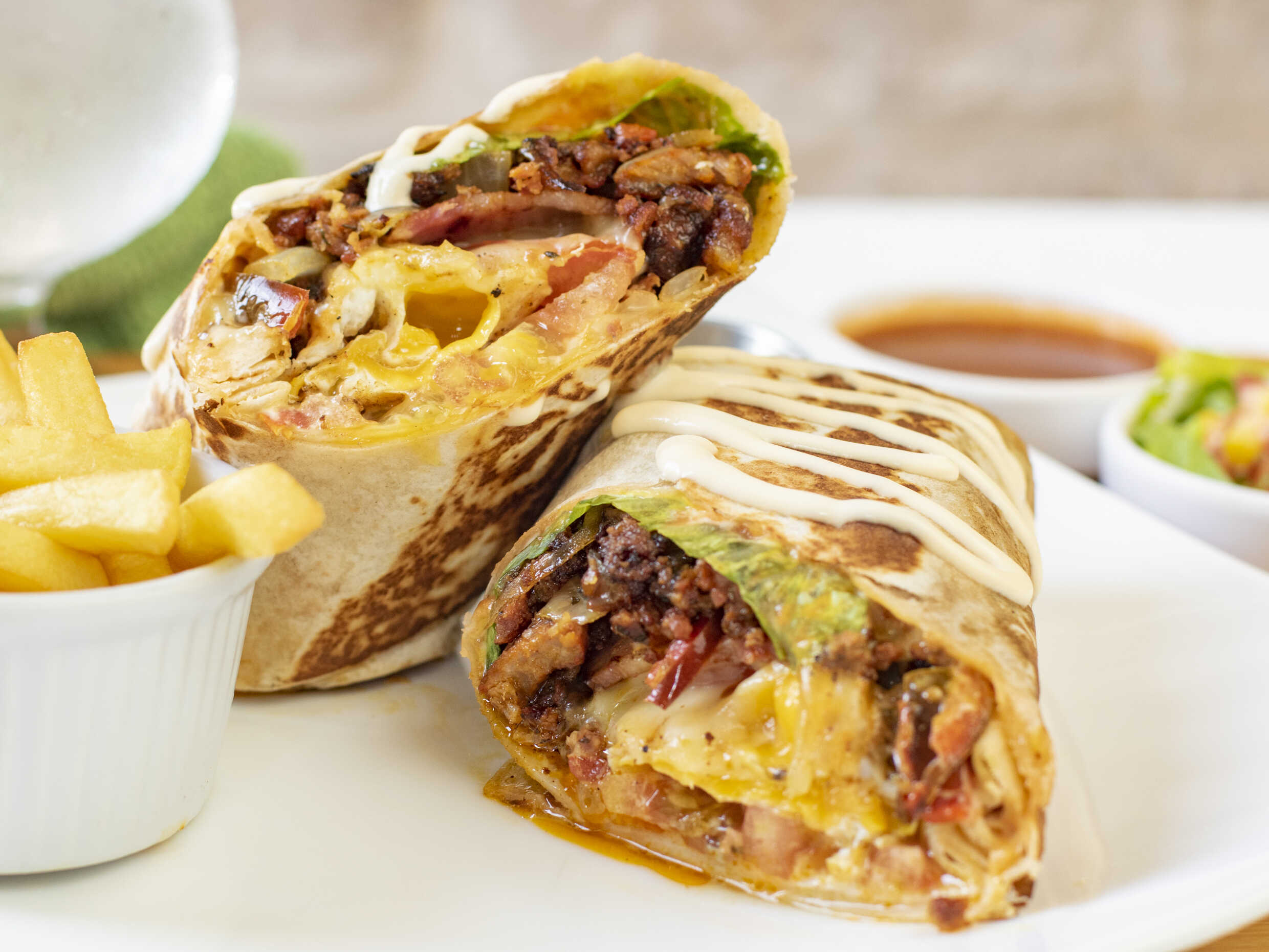 Tortilla de trigo, arroz, frijoles enteros, queso monterrey, gratinado, natilla, cebolla, chile dulce, incluye huevo frito y acompañamiento: ensalada o papas fritas.