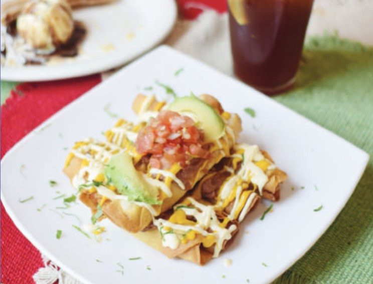 Seis tacos, dos de res, dos de pollo, dos de queso, envueltos en tortilla de trigo dorada, bañados con queso cheddar, frijoles, natilla, aguacate y pico de gallo.