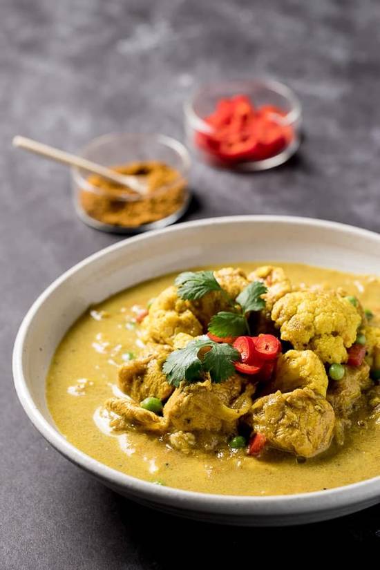 Trozos de pechuga de pollo deshuesado con hojas de curry, cebollas, hinojo, leche de coco y cardamomo.