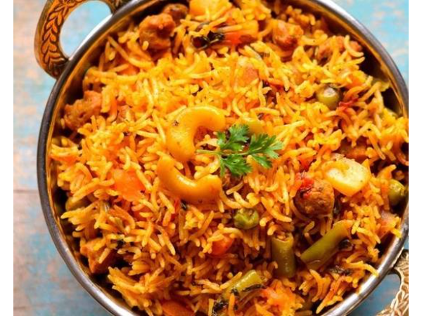 Arroz basmati aromático de grano largo con vegetales, cardamomo, cebolla caramelizada y azafrán.