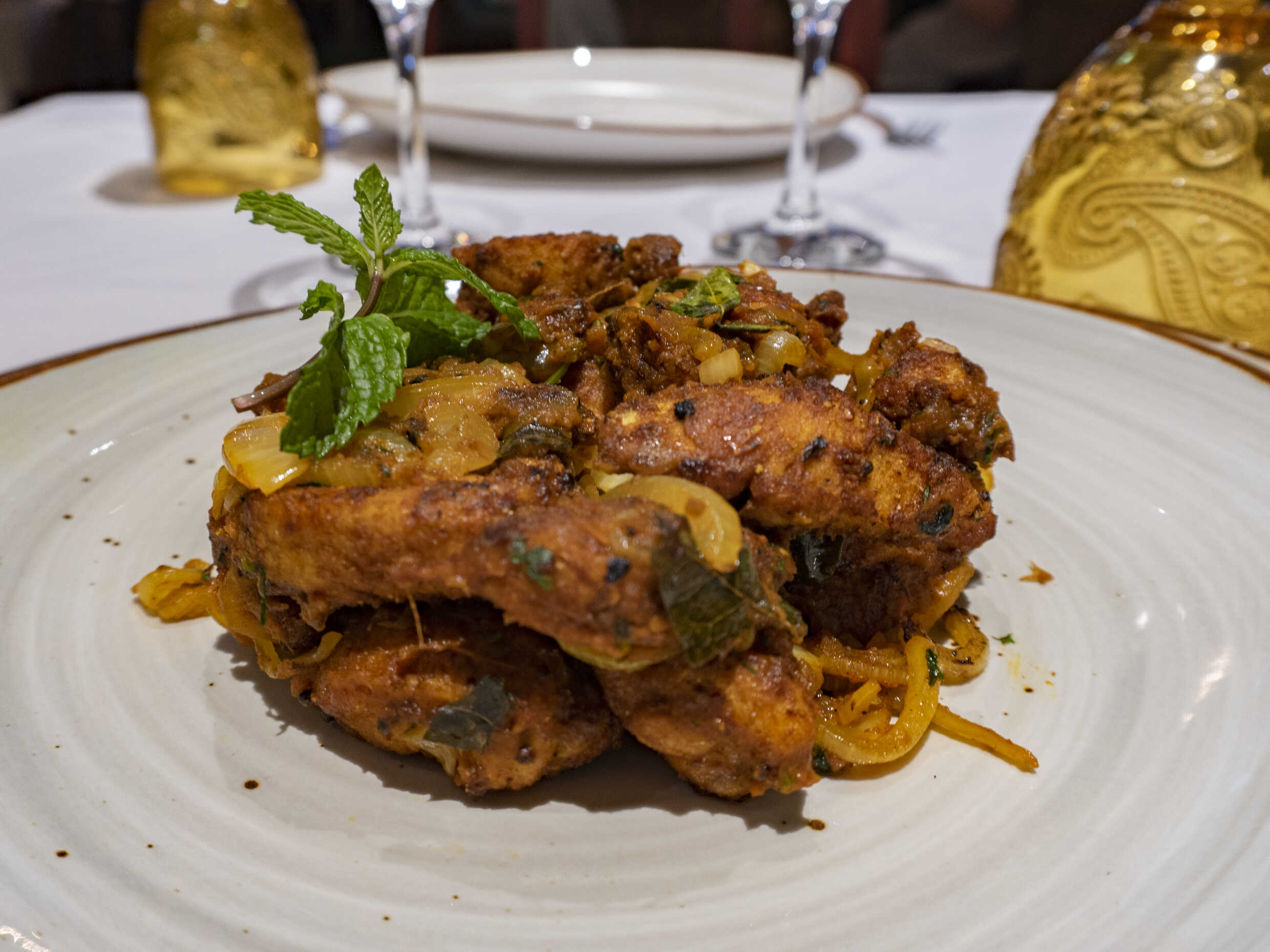 Trozos de res cocinados en salsa suave de marañón, cebolla y cardamomo.