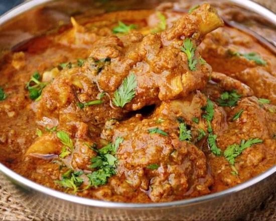 Trozos de pechuga de pollo deshuesado, en salsa densa de tomate, cebolla, chile dulce, marañón, culantro fresco y garam masala.