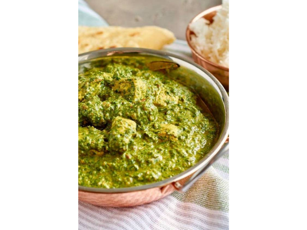 Trozos de pechuga de pollo deshuesado en salsa de espinaca, ajo, fenogreco, cebolla picada y tomate.