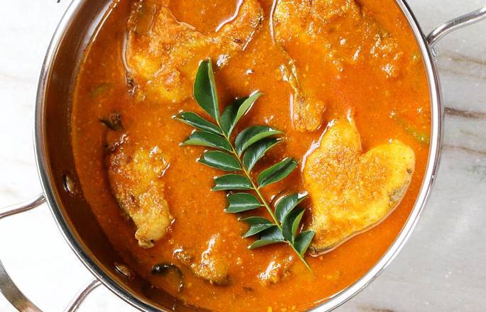 Filete de pescado cocinado en leche de coco, semillas de mostaza, cúrcuma, cebolla y hojas de curry.
