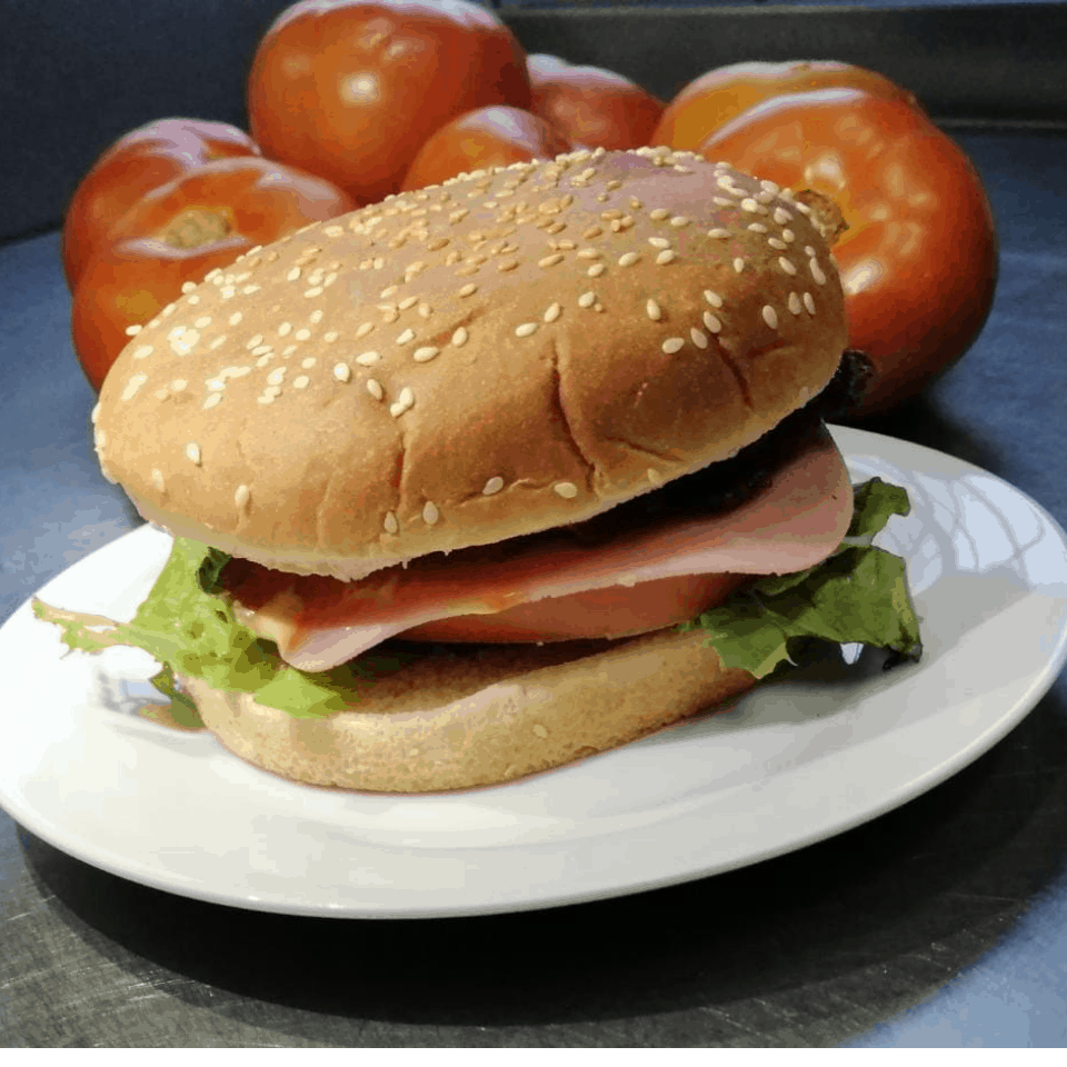 Pan de hamburguesa grande con ensalada fresca y una torta grande 100% casera, jamon, ademas de la deliciosa y exclusiva mayonesa casera y salsa