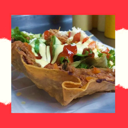 Tortilla de maiz amarillo, tostada en forma de canasta, frijoles molidos, carne o pollo mechado, ensalada fresca y salsas y queso blanco