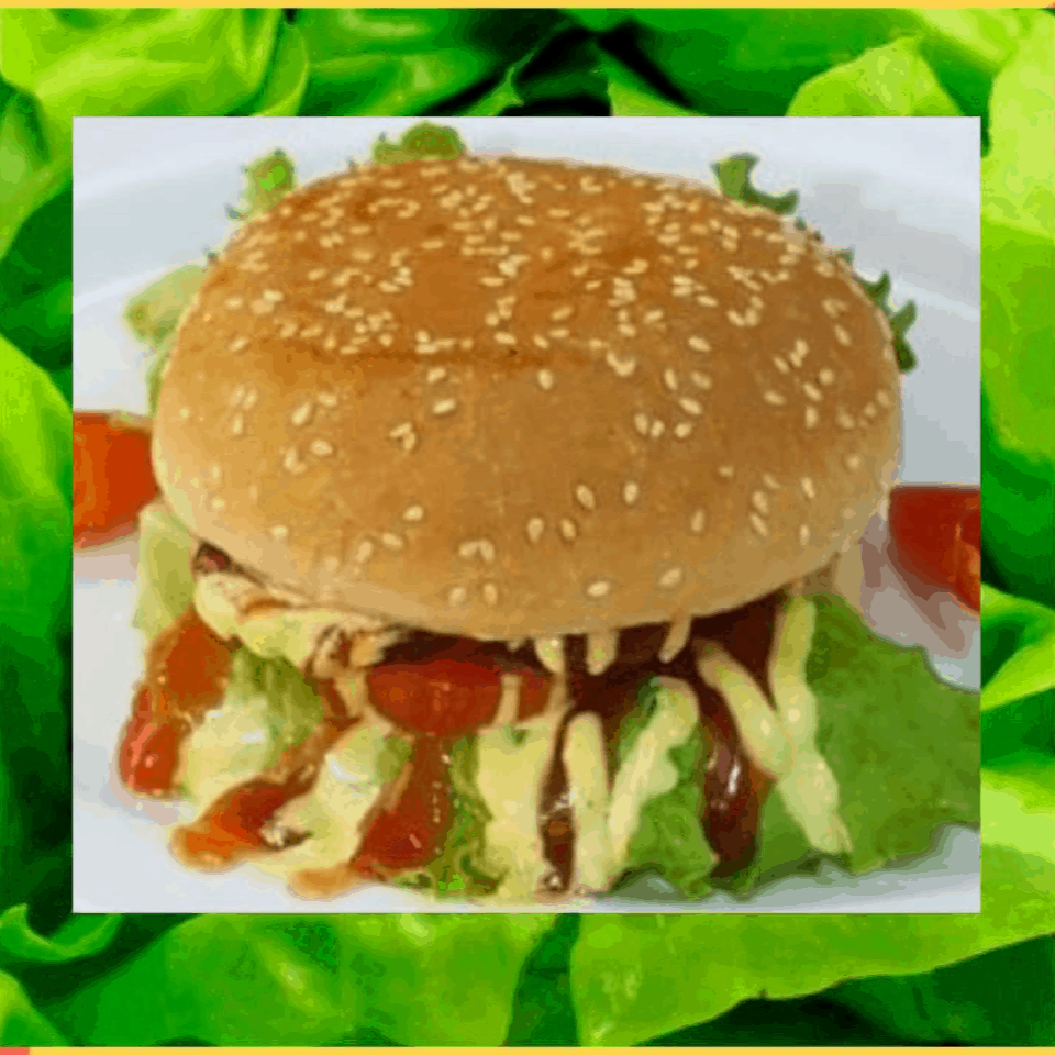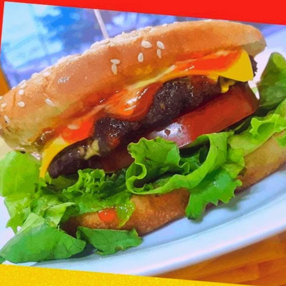 Pan de hamburguesa grande con ensalada fresca, queso amarillo , y una torta grande 100% casera, ademas de la deliciosa y exclusiva mayonesa casera y salsa