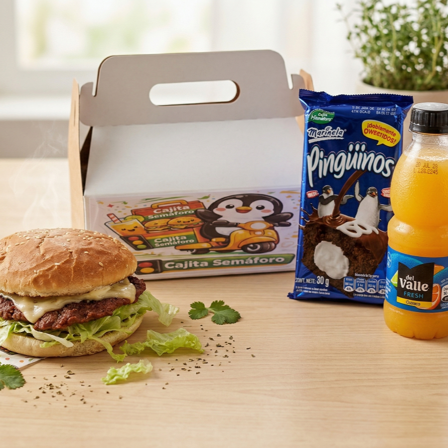 hamburguesa (pan, torta de res, tomate, lechuga y salsas,) Pinguino Marinela, y Jugo de Naranja del Valle