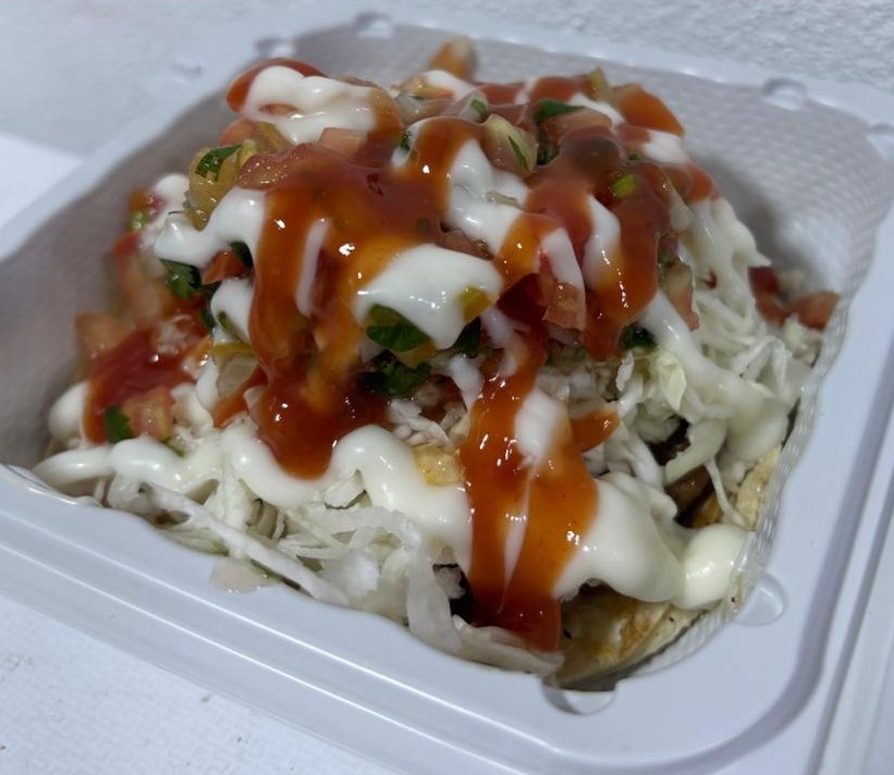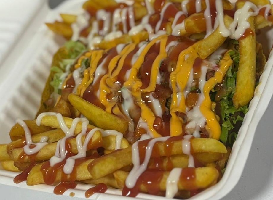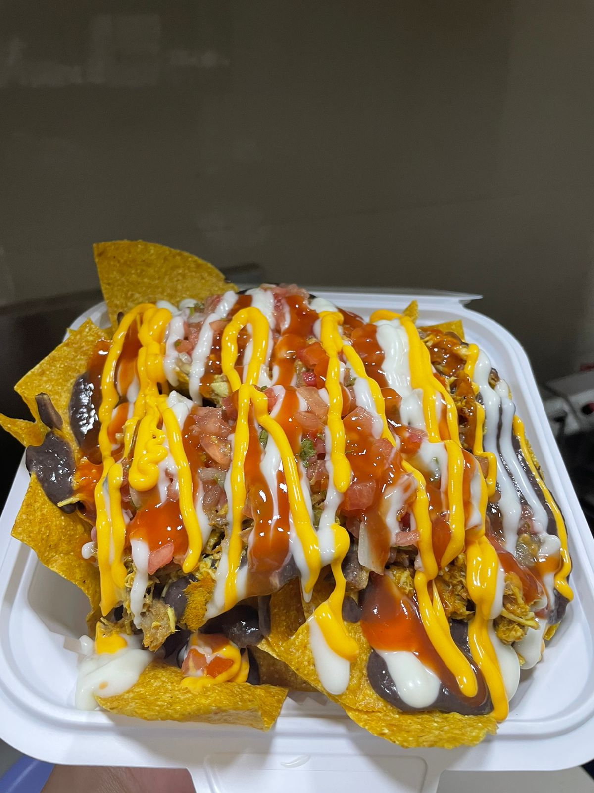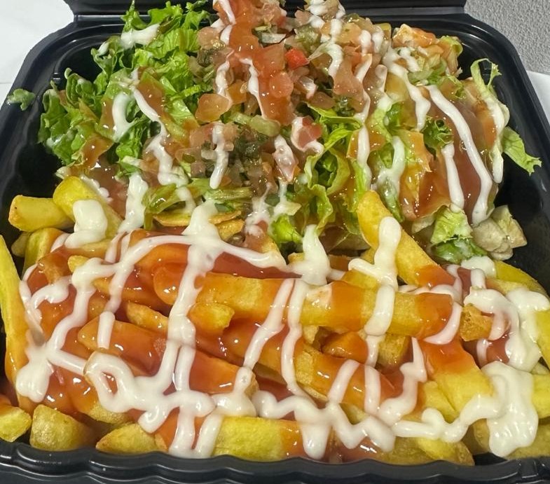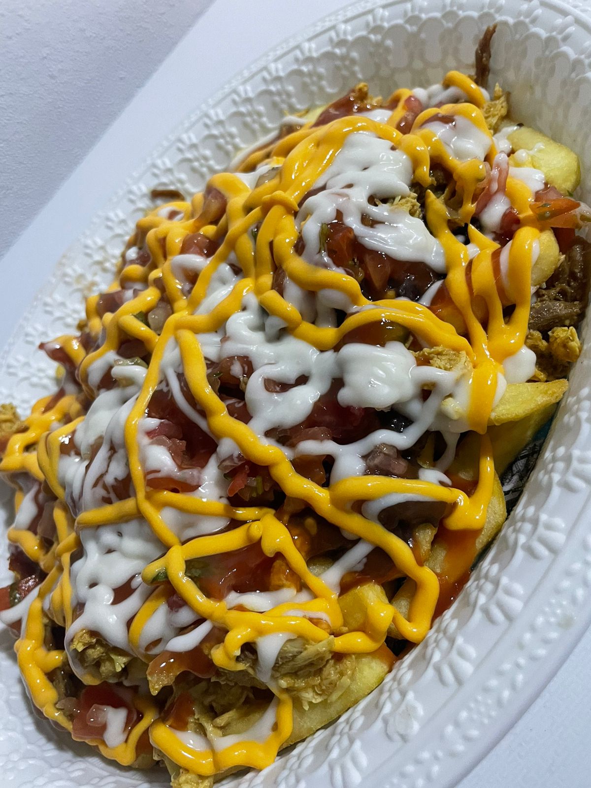 (Papas fritas con carne mechada, pico de gallo y salsas de la casa)