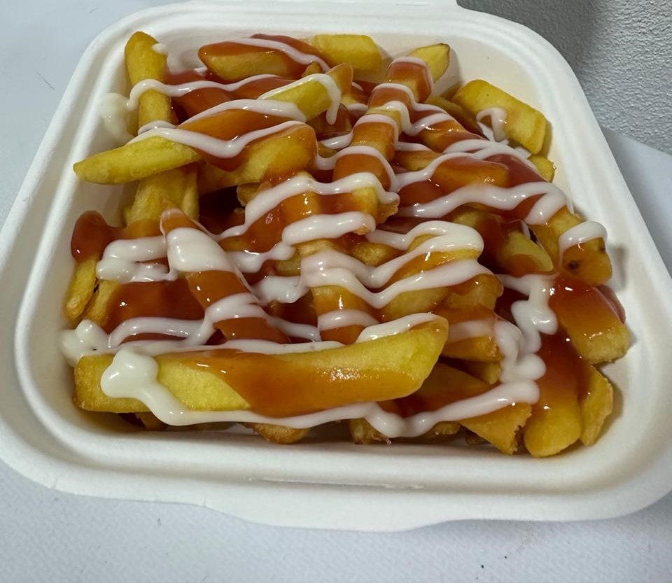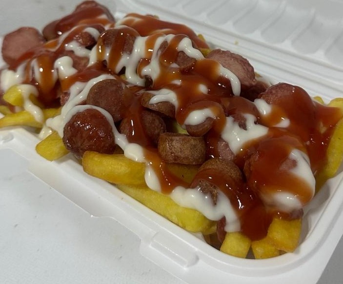 (Papas frescas con trozos de salchicha acompañadas con salsas de la casa con un tamaño mayor)