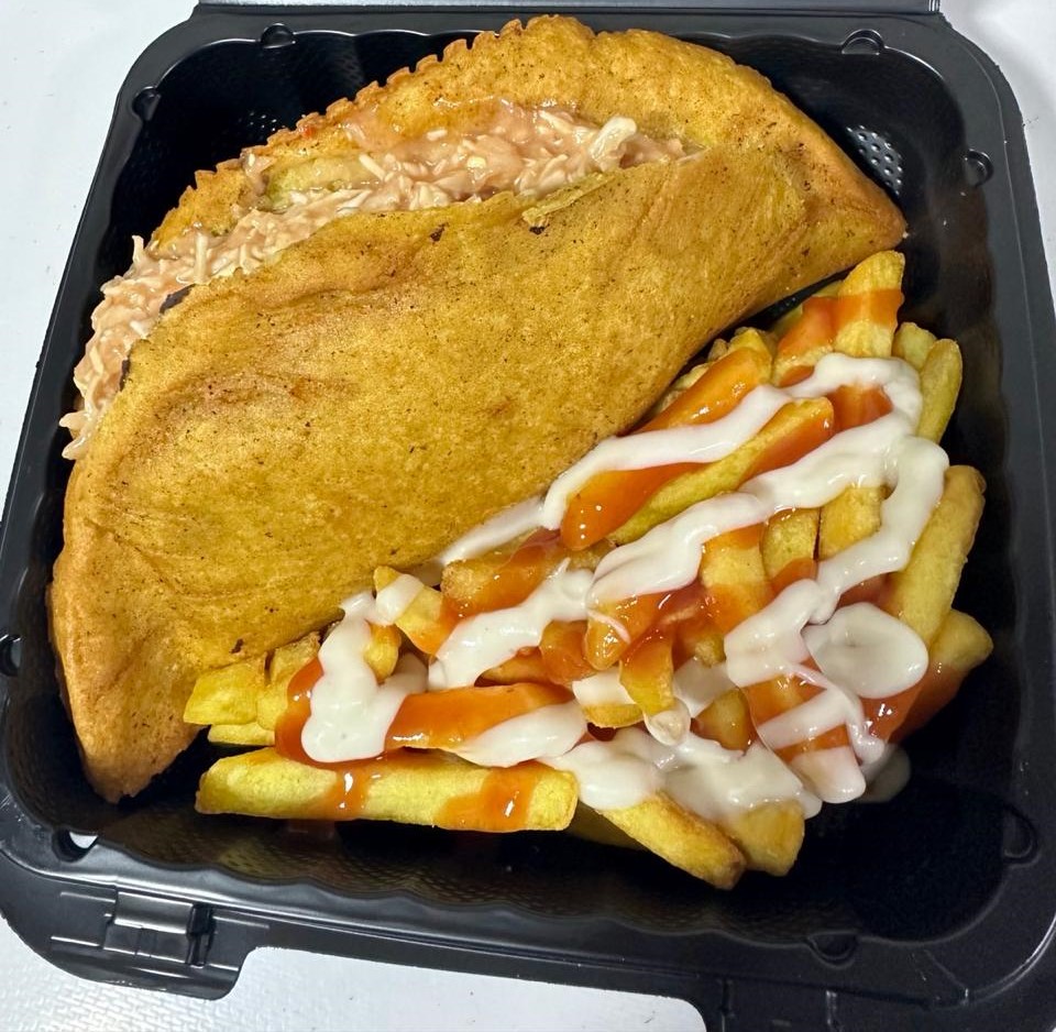 (Pan fresco con una sabrosa salchicha, lechuga o repollo y salsas de la casa acompañado de papas fritas