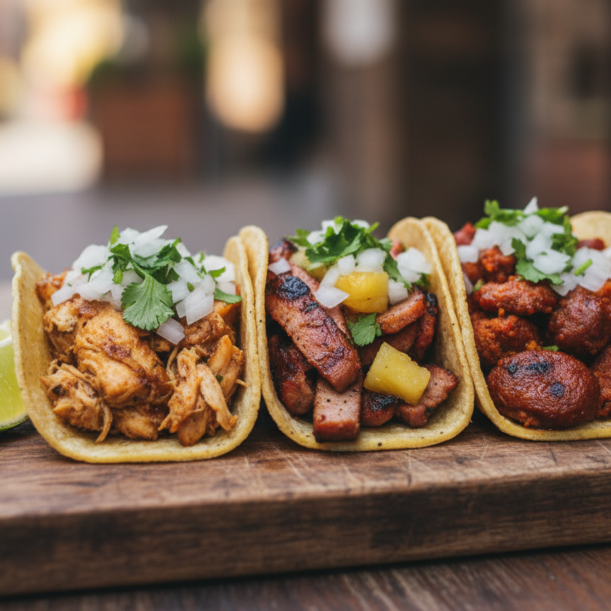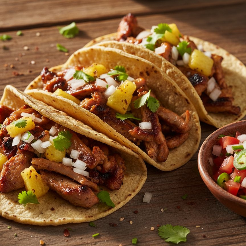 Deléitate con tres auténticos tacos de carne al pastor, marinada a la perfección y servida con un vibrante pico de gallo fresco. ¡Una explosión de sabor en cada mordisco!